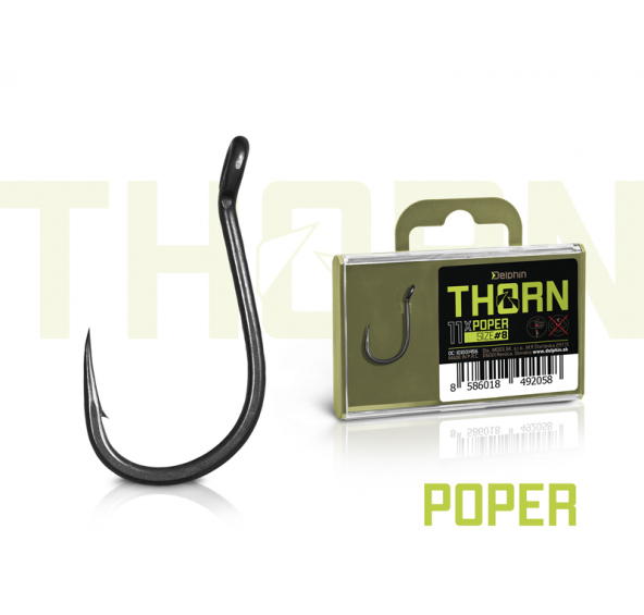 Díky moderním technologiím, které byly použity při výrobě jsou tyto háčky synonymem nekompromisní pevnosti a maximální ostrosti. Háčky ze série THORN disponují titanX povrchovou úpravou, čímž nabývají matný šedý povrch, který je navíc dokonale hladký pro snadné proniknutí do kapří tlamy. TitanX se stará také o zpevnění a odolnost celého háčku. Pomocí aplikované technologie Ultrapoint 4.8, bylo možné vytvořit delší hrot, který poskytuje přímo neuvěřitelnou ostrost. Háčky Delphin THORN jsou balené v praktické krabičce, ve které bude jejich ostří vždy důkladně chráněné. Na krabičce se navíc nachází držák s očkem pro zavěšení do prodejen, který lze snadno odstranit odlomením bez jakéhokoli nástroje díky čemuž krabička ve vaší výbavě zabere podstatně méně místa. THORN Poper je háček specifický očkem vyhnutým do vnější strany. Takové provedení ho předurčuje především pro použití s pop-up nástrahami.