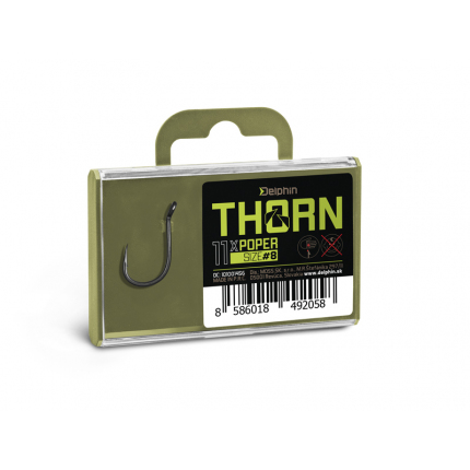 Delphin THORN je prémiová řada kaprařských háčků nejvyšší kvality. Díky moderním technologiím, které byly použity při výrobě jsou tyto háčky synonymem nekompromisní pevnosti a maximální ostrosti. Háčky ze série THORN disponují titanX povrchovou úpravou, čímž nabývají matný šedý povrch, který je navíc dokonale hladký pro snadné proniknutí do kapří tlamy. TitanX se stará také o zpevnění a odolnost celého háčku. Pomocí aplikované technologie Ultrapoint 4.8, bylo možné vytvořit delší hrot, který poskytuje přímo neuvěřitelnou ostrost. Háčky Delphin THORN jsou balené v praktické krabičce, ve které bude jejich ostří vždy důkladně chráněné. Na krabičce se navíc nachází držák s očkem pro zavěšení do prodejen, který lze snadno odstranit odlomením bez jakéhokoli nástroje díky čemuž krabička ve vaší výbavě zabere podstatně méně místa. THORN Poper je háček specifický očkem vyhnutým do vnější strany. Takové provedení ho předurčuje především pro použití s pop-up nástrahami. Výborně se hodí na tvorbu montáží jako Chod rig, Multi rig, Zig rig a podobně. Díky mírnému zakřivení hrotu dovnitř bude po záseku dokonale sedět v kapří tlamě. Technický parametr: háček osově rovný