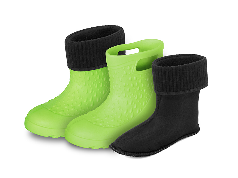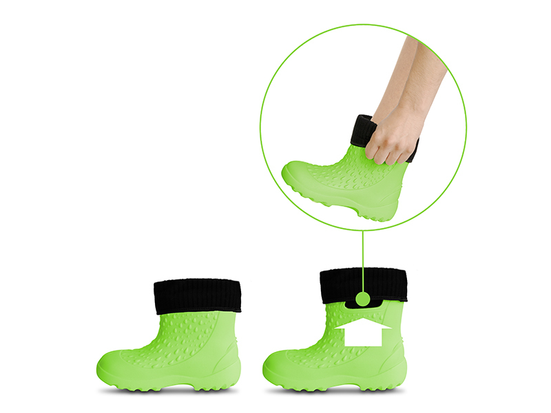 Hřejivá vložka holínek je vyjímatelná, takže jsou vhodné pro všechna čtyři roční období. Jsou vyrobeny z EVA pěny, takže jsou dostatečně poddajné a flexibilní. V horní části se nacházejí po obou stranách výřezy, pomocí kterých lze snáze natáhnout holínku na chodidlo dítěte.