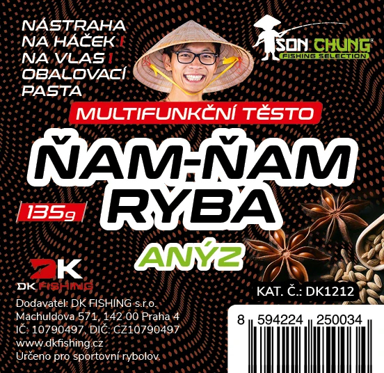 Ňam-Ňam ryba je další z výrobků, které Šon uvádí na trh. A jak je jeho zvykem, o inovace a nápady není nouze. Originální balení vás zaujme. Nejvíce vás ale překvapí možnosti využití. Je jich nepřeberné množství a vy můžete těsto: nastražit jednoduše na háček nastražit mimo háček použít jako obalovací pastu na boilies případně obalit olovo a použít jako vnadící směs uválet si kuličku jako boilies nakrájet na kostičky nebo jakékoliv tvary Vymyslete si svůj vlastní způsob lovu. My vám garantujeme, že Ňam-Ňam ryba pomalu uvolní do okolí atraktanty, vůně a jemné částečky, které velmi lákají ryby. I přes tyto vlastnosti vydrží nastražena dostatečně dlouhou dobu. Po otevření doporučujeme obalit fólií a uložit do ledničky, následně spotřebujte co nejdříve. Anýzová příchuť je velmi tradiční a vyzkoušená. V kombinaci s fluo zelenou barvou jde o vítěznou kombinaci! Váha: 135 g Příchuť: Anýz...