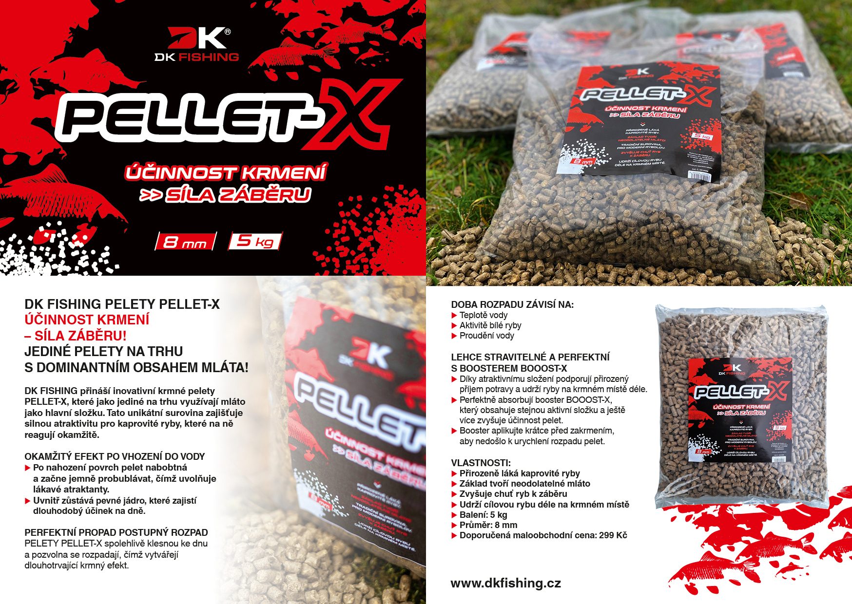 Pellet-X jsou lehce stravitelné, což podporuje přirozenou chuť k příjmu potravy a zajišťuje, že se ryby na krmném místě zdrží déle. Peleta zároveň výborně přijímá booster, který byl k těmto peletám speciálně vyvinut a obsahuje stejnou aktivní složku, čímž se ještě více zvyšuje jejich účinnost. Booster aplikujte krátce před zakrmením, aby nedošlo k urychlení rozpadu pelet.