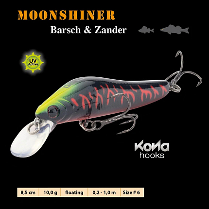 Model Moonshiner Z se velmi dobře uplatní zejména při lovu za šera, v noci nebo při vedení podél kamenných břehů. Syté UV aktivní barvy zvyšují nápadnost nástrahy a rozšiřují možnosti jejího použití právě v horších světelných podmínkách. Wobler tak představuje velmi zajímavou volbu pro cílený lov dravců v mělčích úsecích vody, kde je důležitý jemný projev i spolehlivá viditelnost nástrahy.