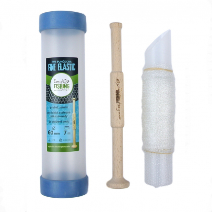 PVA punčocha FINE ELASTIC v průměru 60 mm, určena do studené vody, pro lehké a středně těžké návnady. V průměru 60 mm je vhodná i pro větší návnady. ELASTIC FINE jsou elastické, lehké a jemné PVA punčochy, speciálně vyráběné pro lehčí až středně těžké návnady a průměrně dlouhý nához. Síťka je vyrobená z kvalitního japonského materiálu. Naše standardní balení je v tubusu, které je na koncích uzavřeno způsobem, který jiní nemají. Používáme totiž gumové uzávěry, které mají několik velkých výhod oproti jiným „renomovaným“ výrobcům. Hlavní výhodou našeho kompletu je_ – trvanlivost gumového uzávěru i při dlouhodobém používání mnoho let, – dokonalá těsnost a odolnost proti vodě, vlhkosti, dešti, rose. Když vám naše balení v tubusu spadne do vody, určitě zůstane cenná punčocha neporušená díky 100% těsnosti. – pružnost a tím i snadnost otevření i uzavření tubusu, bez námahy a bez použití jiných nástrojů k otevření, ulomených nehtů, říznutých prstů atd. – vnitřní tubus je v horní části upravený seříznutím pro snadnější nabírání náplně, např. z krabičky nebo jiné nádoby s návnadou. Nemusíte používat další přípravek jako třeba trychtýř nebo jinou násypku. S naším tubusem zvládnete naplnění punčochy jednou rukou!!! – na vnitřním tubusu je navléknutá vlastní punčocha, zajištěná gumičkou proti posunu a vše je zataveno v ochranné folii. – standardní součástí celého kompletu je ORIGINÁLNÍ DŘEVĚNÉ PĚCHOVADLO. – uvnitř balení najdete malý prospekt s návodem na použití. Snažíme se dělat naše výrobky vždy s větší přidanou hodnotou než ostatní, naším cílem je hlavně spokojený uživatel, který si výrobky EASYFISHING oblíbí pro jejich spolehlivost a pohodlí používání a bude se k nim vracet. – všechna naše provedení punčoch jsou barevně odlišena. Usnadňujeme vám orientaci v nabídce, můžete si lépe vybírat punčochy pro vaše specifické použití pro různé podmínky lovu podle teploty vody, váhy návnady, velikosti jednotlivých kousků (pelety,boilies….).