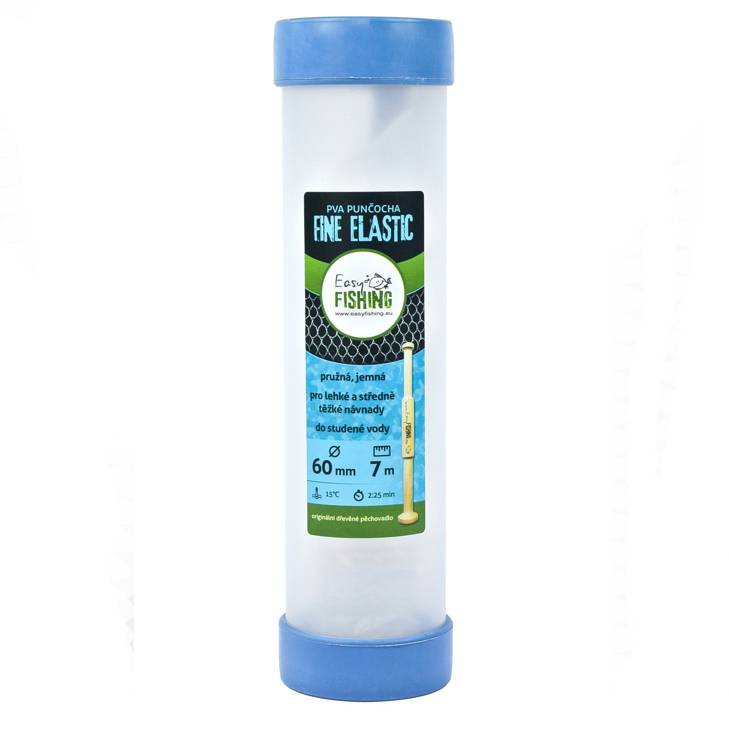 PVA punčocha FINE ELASTIC v průměru 60 mm, určena do studené vody, pro lehké a středně těžké návnady. V průměru 60 mm je vhodná i pro větší návnady. ELASTIC FINE jsou elastické, lehké a jemné PVA punčochy, speciálně vyráběné pro lehčí až středně těžké návnady a průměrně dlouhý nához. Síťka je vyrobená z kvalitního japonského materiálu. Naše standardní balení je v tubusu, které je na koncích uzavřeno způsobem, který jiní nemají. Používáme totiž gumové uzávěry, které mají několik velkých výhod oproti jiným „renomovaným“ výrobcům. Hlavní výhodou našeho kompletu je_ – trvanlivost gumového uzávěru i při dlouhodobém používání mnoho let, – dokonalá těsnost a odolnost proti vodě, vlhkosti, dešti, rose. Když vám naše balení v tubusu spadne do vody, určitě zůstane cenná punčocha neporušená díky 100% těsnosti. – pružnost a tím i snadnost otevření i uzavření tubusu, bez námahy a bez použití jiných nástrojů k otevření, ulomených nehtů, říznutých prstů atd. – vnitřní tubus je v horní části upravený seříznutím pro snadnější nabírání náplně, např. z krabičky nebo jiné nádoby s návnadou. Nemusíte používat další přípravek jako třeba trychtýř nebo jinou násypku. S naším tubusem zvládnete naplnění punčochy jednou rukou!!! – na vnitřním tubusu je navléknutá vlastní punčocha, zajištěná gumičkou proti posunu a vše je zataveno v ochranné folii. – standardní součástí celého kompletu je ORIGINÁLNÍ DŘEVĚNÉ PĚCHOVADLO. – uvnitř balení najdete malý prospekt s návodem na použití. Snažíme se dělat naše výrobky vždy s větší přidanou hodnotou než ostatní, naším cílem je hlavně spokojený uživatel, který si výrobky EASYFISHING oblíbí pro jejich spolehlivost a pohodlí používání a bude se k nim vracet. – všechna naše provedení punčoch jsou barevně odlišena. Usnadňujeme vám orientaci v nabídce, můžete si lépe vybírat punčochy pro vaše specifické použití pro různé podmínky lovu podle teploty vody, váhy návnady, velikosti jednotlivých kousků (pelety,boilies….).