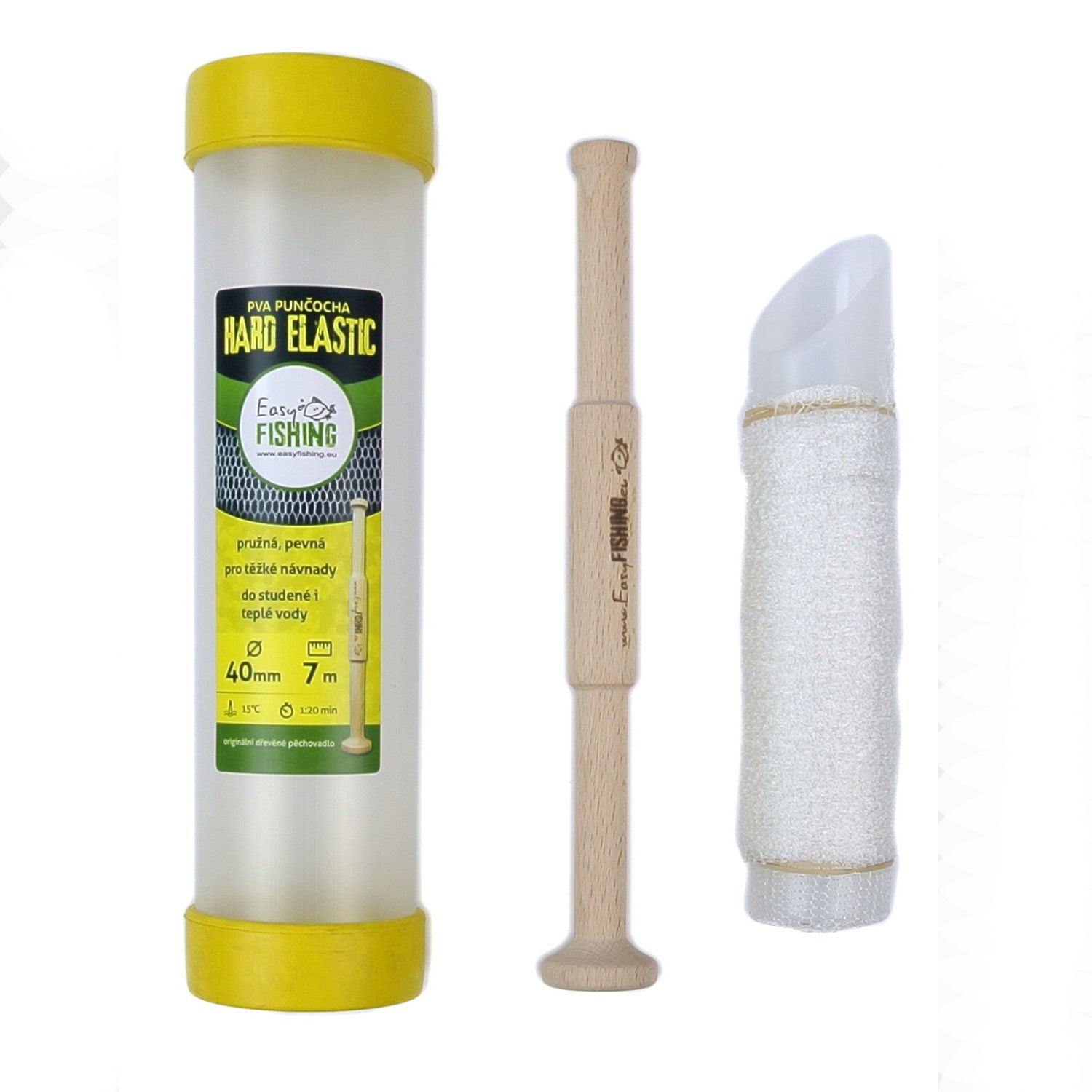 Základní balení PVA punčochy HARD ELASTIC o průměru 40 mm a délkou 7 m. Tato punčocha je vhodná jak do teplé, tak studené vody, i pro těžší návnady. Vazba punčochy je pevná a pružná. Hodí se pro celoroční používání. HARD ELASTIC jsou elastické, hrubší a pevnější PVA punčochy, speciálně vyráběné pro těžké i lehké návnady a dlouhý nához. Snesou vysoké mechanické namáhání. Punčochy jsou vyrobené z kvalitního japonského materiálu. Naše standardní balení je v tubusu, které je na koncích uzavřeno způsobem, který jiní nemají. Používáme totiž gumové uzávěry, které mají několik velkých výhod oproti jiným „renomovaným“ výrobcům. Hlavní výhodou našeho kompletu je_ – trvanlivost gumového uzávěru i při dlouhodobém používání mnoho let, – dokonalá těsnost a odolnost proti vodě, vlhkosti, dešti, rose. Když vám naše balení v tubusu spadne do vody, určitě zůstane cenná punčocha neporušená díky 100% těsnosti. – pružnost a tím i snadnost otevření i uzavření tubusu, bez námahy a bez použití jiných nástrojů k otevření, ulomených nehtů, říznutých prstů atd. – vnitřní tubus je v horní části upravený seříznutím pro snadnější nabírání náplně, např. z krabičky nebo jiné nádoby s návnadou. Nemusíte používat další přípravek jako třeba trychtýř nebo jinou násypku. S naším tubusem zvládnete naplnění punčochy jednou rukou!!! – na vnitřním tubusu je navléknutá vlastní punčocha, zajištěná gumičkou proti posunu a vše je zataveno v ochranné folii. – standardní součástí celého kompletu je ORIGINÁLNÍ DŘEVĚNÉ PĚCHOVADLO. – uvnitř balení najdete malý prospekt s návodem na použití. Snažíme se dělat naše výrobky vždy s větší přidanou hodnotou než ostatní, naším cílem je hlavně spokojený uživatel, který si výrobky EASYFISHING oblíbí pro jejich spolehlivost a pohodlí používání a bude se k nim vracet. – všechna naše provedení punčoch jsou barevně odlišena. Usnadňujeme vám orientaci v nabídce, můžete si lépe vybírat punčochy pro vaše specifické použití pro různé podmínky lovu podle teploty vody, váhy návnady, velikosti jednotlivých kousků (pelety, boilies, …).
