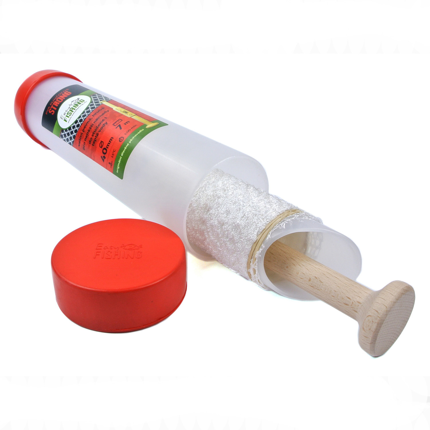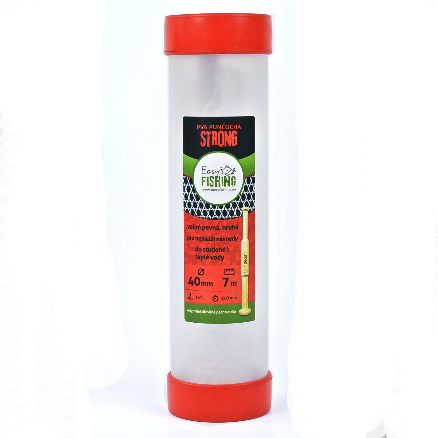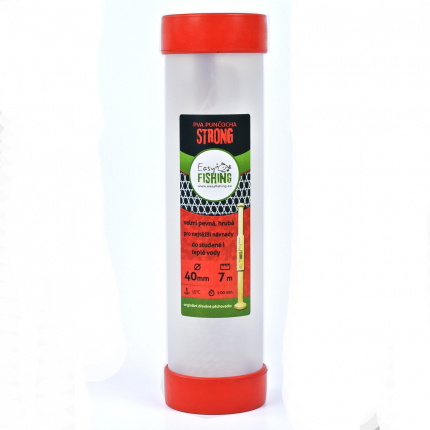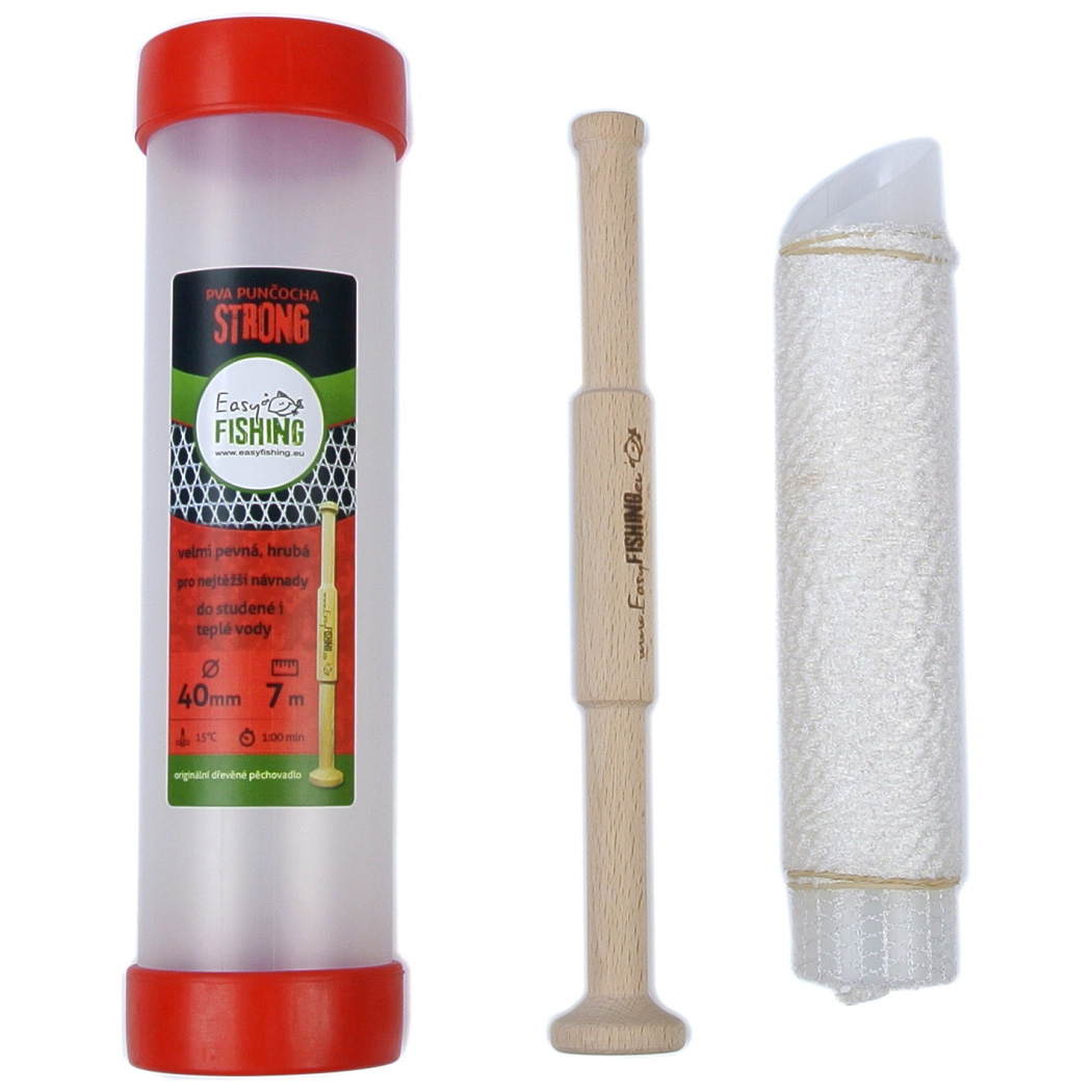 Naše nejpevnější PVA punčocha, určena pro nejtěžší návnady a nejdelší náhozy. Rozměr oka v provedení STRONG 40 mm je 4x5mm. Vazba této punčochy je pevná, takže na rozdíl od provedení ELASTIC nelze průměr punčochy zvětšit. Varianta PVA punčochy STRONG je určena pro nejtěžší návnady a nejdelší náhozy. Použití pevné vazby a silného PVA materiálu zaručuje vysokou odolnost v tahu. Naše standardní balení je v tubusu, které je na koncích uzavřeno způsobem, který jiní nemají. Používáme totiž gumové uzávěry, které mají několik velkých výhod oproti jiným „renomovaným“ výrobcům. Hlavní výhodou našeho kompletu je_ – trvanlivost gumového uzávěru i při dlouhodobém používání mnoho let, – dokonalá těsnost a odolnost proti vodě, vlhkosti, dešti, rose. Když vám naše balení v tubusu spadne do vody, určitě zůstane cenná punčocha neporušená díky 100% těsnosti. – pružnost a tím i snadnost otevření i uzavření tubusu, bez námahy a bez použití jiných nástrojů k otevření, ulomených nehtů, říznutých prstů atd. – vnitřní tubus je v horní části upravený seříznutím pro snadnější nabírání náplně, např. z krabičky nebo jiné nádoby s návnadou. Nemusíte používat další přípravek jako třeba trychtýř nebo jinou násypku. S naším tubusem zvládnete naplnění punčochy jednou rukou!!! – na vnitřním tubusu je navléknutá vlastní punčocha, zajištěná gumičkou proti posunu a vše je zataveno v ochranné folii. – standardní součástí celého kompletu je ORIGINÁLNÍ DŘEVĚNÉ PĚCHOVADLO. – uvnitř balení najdete malý prospekt s návodem na použití. Snažíme se dělat naše výrobky vždy s větší přidanou hodnotou než ostatní, naším cílem je hlavně spokojený uživatel, který si výrobky EASYFISHING oblíbí pro jejich spolehlivost a pohodlí používání a bude se k nim vracet. – všechna naše provedení punčoch jsou barevně odlišena. Usnadňujeme vám orientaci v nabídce, můžete si lépe vybírat punčochy pro vaše specifické použití pro různé podmínky lovu podle teploty vody, váhy návnady, velikosti jednotlivých kousků (pelety,boilies….)