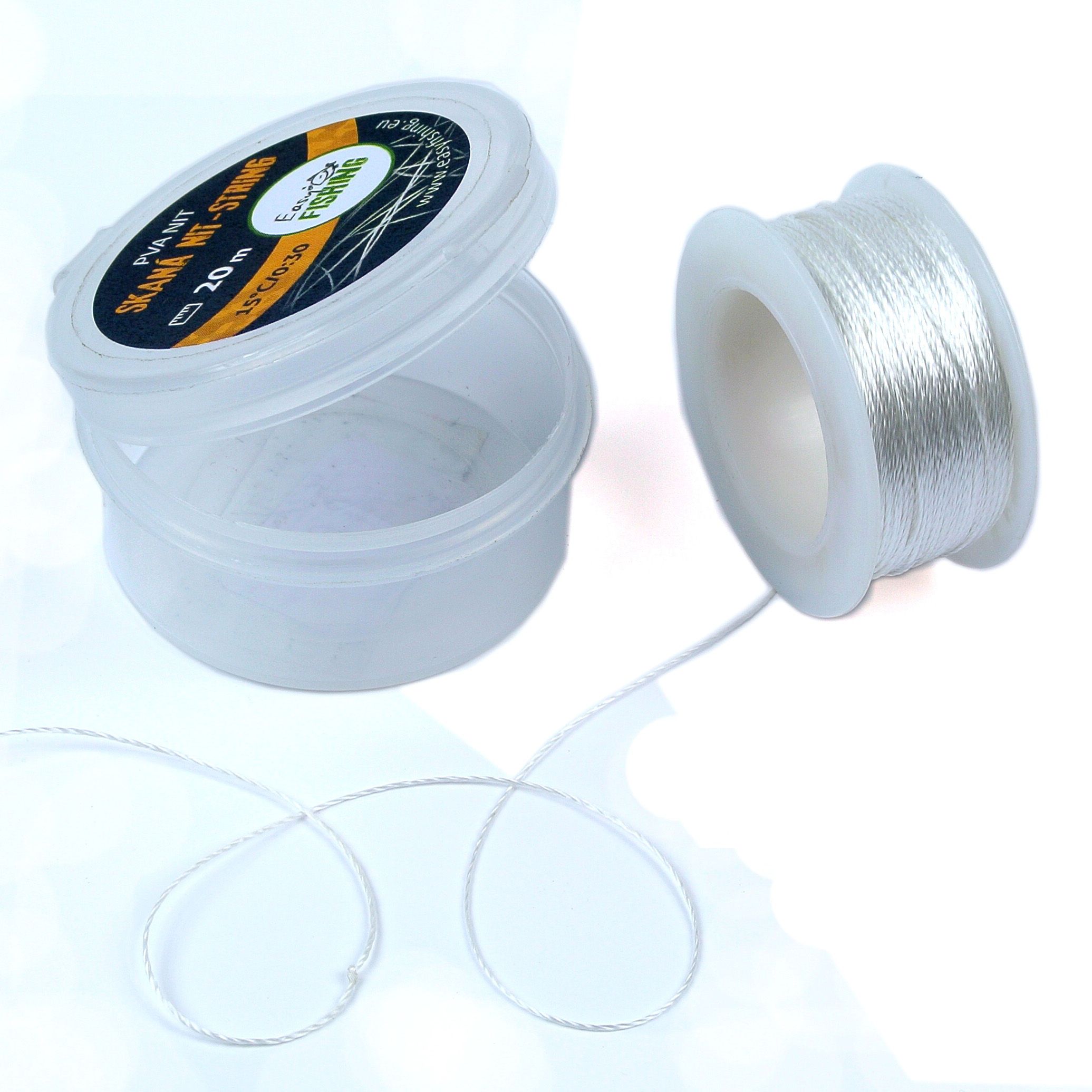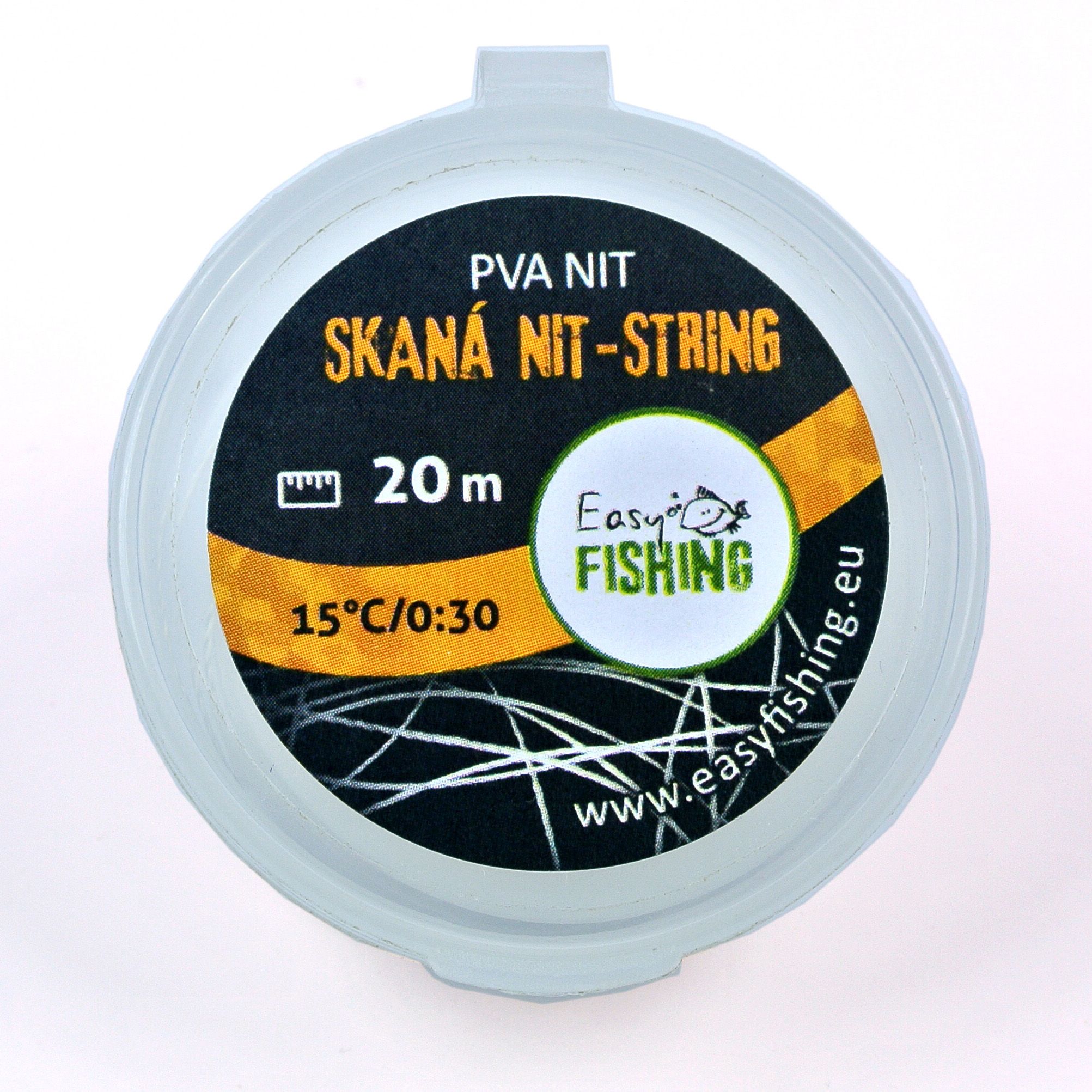 Naše PVA NIT je dostatečně pevná pro své účely. Pevnost v tahu je 15N, nebo-li vydrží zátěž až 1,5 kg, než se přetrhne. Vhodná na výrobu stringerů, zavazování PVA punčoch a sáčků, upevnění sestavy nebo třeba svázání návnady. Rozpustnost je 30 vteřin ve vodě 15°C. NIT je správný název pro tento druh výrobku. Název šňůrka, který používají jiní, patří výrobku, který se vyrábí naprosto odlišnou technologií. Neschováváme se za obchodní finty při pojmenování výrobku. Nit EasyFISHING je dostatečně pevná pro účely, ke kterým je určena, zakroucená (správný termín je seskaná) z několika pramenů PVA střiže tak, aby výsledná pevnost byla nejvyšší možná, které lze tímto způsobem výroby dosáhnout. Lehké návnady můžete s úspěchem provázat naší nití, určitě vás nezklame. Pevnost v tahu naší nitě je 15 N, to znamená, že vydrží cca 1,5 kg zátěž, než dojde k přetržení. Použití: klasické a osvědčené použití je na výrobu stringerů, zavazování PVA punčoch a sáčků, upevnění sestavy, svázání návnady atd. Doba rozpouštění ve vodě 15° C je 30 vteřin. Balení: aby byla vaše PVA NIT ochráněna proti vlhkosti a vodě, je namotána na cívce a uzavřena ve speciálním pouzdru, uzavírací kulaté krabičce, která je odolná proti vlhkosti. Velmi kvalitní uzavření zabrání přístupu vlhkosti a tím zničení důležité součásti vaší kaprařské výbavy. Na naše balení se můžete spolehnout. Až PVA spotřebujete, tak krabičku můžete s úspěchem ještě dlouho potom používat, například pro drobnosti, kterých je na loveckých výpravách potřeba vždycky hodně.