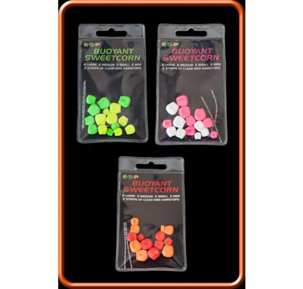 ESP umělá plovoucí kukuřice- Má velký počet zrn v balení a to 16ks (6 velkých, 6 středních, 2 malé a 2 mini kukuřice) + 2 proužky ESP zarážek pro kukuřici. Novinkou u těchto kukuřic jsou speciální drážky, do kterých dokonale zapadnou zarážky, které nám zabraňují stažení či spadnutí zrn. Tyto drážky jsou buď na konci, nebo v prostředku zrna a to proto, abychom mohli vytvářet různé kombinace, při jejich nastražování. Toto vybrání a zarážky sedí téměř v jedné rovině s povrchem kukuřice, které vypadá nejen velmi elegantně, ale také skutečně pomáhají při lovu ve vodách, kde se nacházejí zlodějské ryby a je jim zdaleka obtížnější ukrást naši návnadu. Jsou k dispozici také klasická zrna bez žlábků.