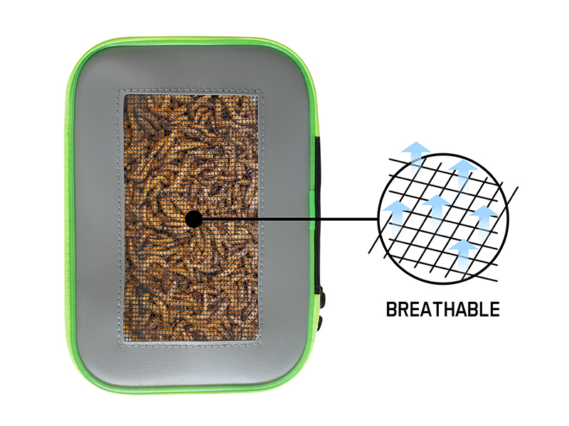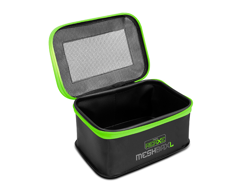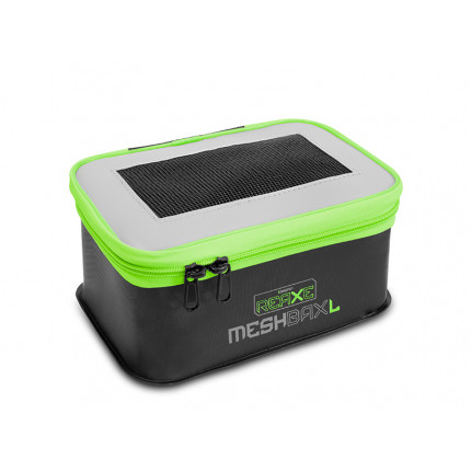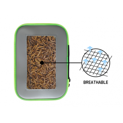 Praktická taška určená primárně pro kostní červy a jiné druhy živých návnad. Víko je tvořeno perforovanou černou síťkou, která zajistí červům dostatek vzduchu, zabrání přehřívání a tím udrží vaši návnadu déle živou a čerstvou. Taštička je černé barvy s šedým víkem, výrazným - dobře viditelným zipem, který ji dokonale uzavře a tím zamezí nechtěnému úniku červů. MeshBAX lze využít také jako univerzální tašku pro různé drobnější rybářské příslušenství či nástrahy, dipy a jiné komponenty. Produkt je vyroben z materiálu EVA, který je snadno omyvatelný a odolný vůči vodě i mechanickému poškození. Technické parametry: Rozměry: 22x15x10cm