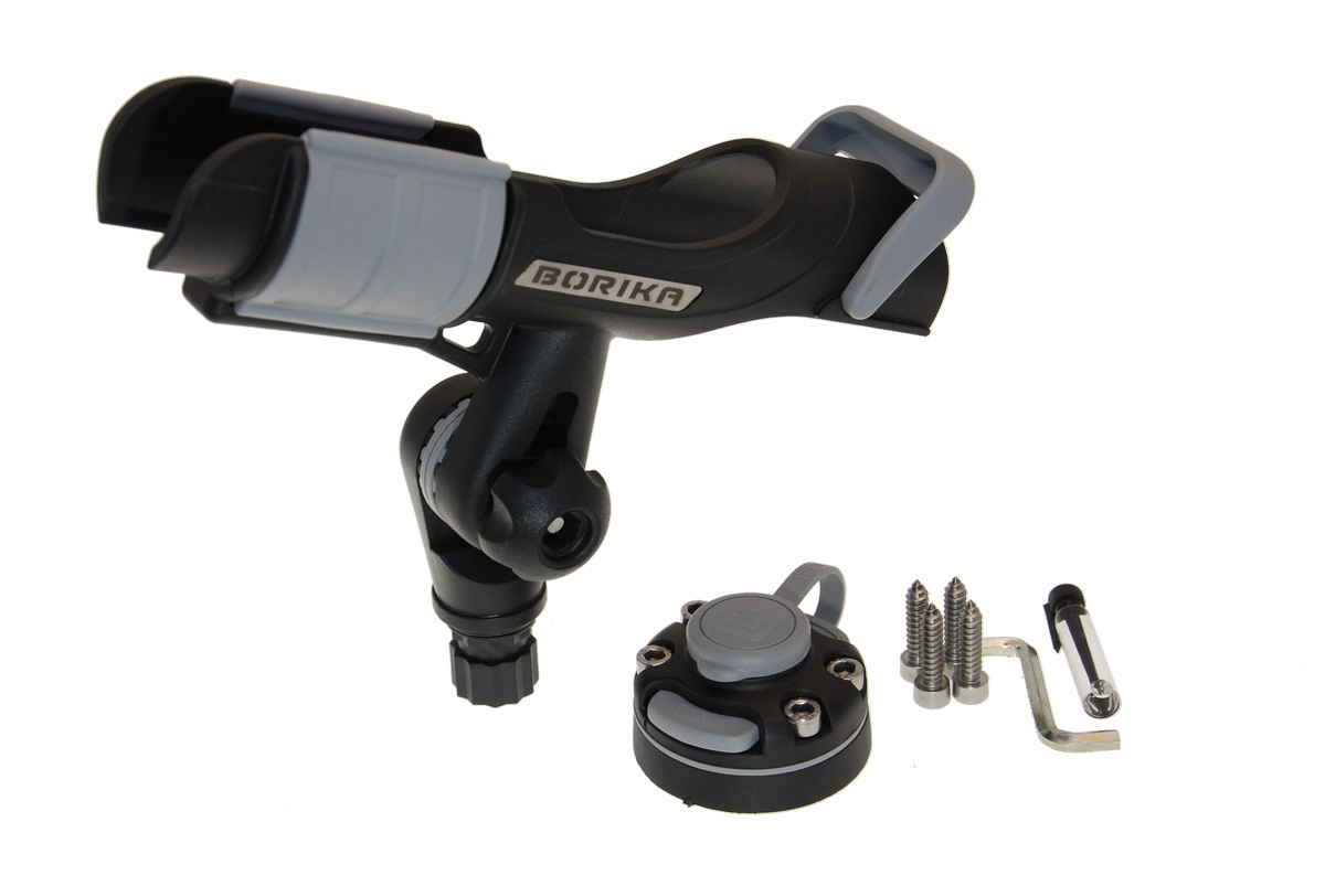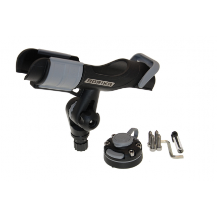 Univerzální držák prutu v setu rychloupínacím držákem Fasten FMB*. Lze jej tak umístit prakticky do jakékoli části člunu. Prut do něj snadno zasunete a zajistíte otočnou pojistkou. Lze jej umístit jak navijákem dolů, tak i nahoru, což je výhodné zejména u multiplikátorů. Zadní opěrka pak umožňuje ještě větší fixaci prutu. Držák můžete namontovat do jakékoli polohy kolem vlastní osy (v horizontálním směru) a kdykoli tuto polohu změnit. Díky kloubu je držák natáčecí také ve vertikálním směru. Držák prutu je vyroben z pevného kvalitního plastu. Na spodku má upevňovací bod, který zasunete a pojistkou zajistíte do rychloupínacího držáku Fasten FMB*. *FMB je univerzální rychloupínací držák se základnou (podložkou), díky jehož velmi jednoduše a spolehlivě fungujícímu zámku můžete připevnit jakékoli příslušenství k lodím, jako je sonda sonaru, držák prutů, deska pro obrazovku sonaru, držáky na tablety, telefony, foťáky či Go pro kamery, vazáky kotvy, upevňovací háčky, vesla, hrazdy a další. Všechny tyto Fasten příslušenství mají na koncích speciálně tvarovaný upevňovací bod, který snadno zapadne do rychloupínacího držáku. Pak už stačí jen zasunout pojistku a příslušenství je pevně spojeno s držákem. Držák je dodáván se čtyřmi vruty, čtyřmi šrouby a utahovacím imbusem. S pomocí vrutů nejprve přišroubujete základnu například do zadního zrcadla lodi, nebo jiné pevné desky. Vrchní část držáku poté snadno připevníte k základně pomocí šroubů.