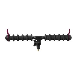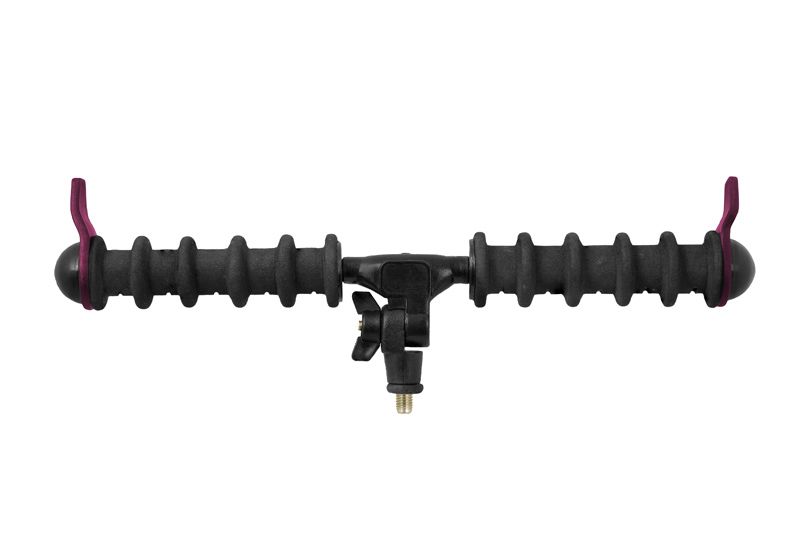 Její nepravidelný tvar odkládacího prostoru pro prut, ho dokonale drží na svém místě. Na obou stranách je ukončena plastovým výběžkem v bordó barvě, který zamezí prutu spadnout na zem při razantním záběru. Držák je osazen univerzálním závitem a kloubem s možností nastavení úhlu sklonu dle potřeby a terénu.
