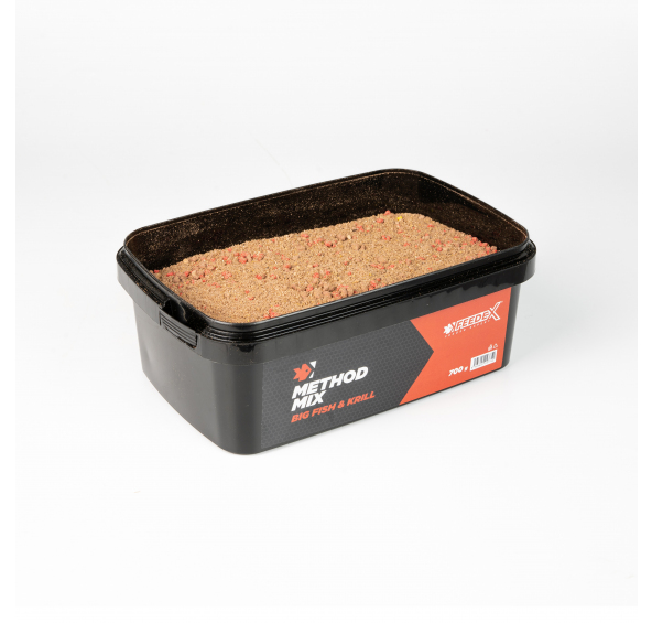 Feeder Expert Method mixy jsou vysoce atraktivní směsi vyvíjené a testované špičkovými feeder rybáři, závodníky i reprezentanty z celé Evropy. Jsou určené k použití do method feeder krmítek. Jejich složení je přizpůsobeno k lovu kaprů či amurů s pomocí feeder techniky. Big Fish & Krill je špičková závodní směs na větší exempláře ryb, která obsahuje enzymatické rozpustné rybí moučky, GLM extrakt, játrový extrakt, krill a další mořské proteiny. Díky nízkému obsahu tuku se dá použít i v chladné vodě. Mix zvlhčete vodou (můžete přidat i tekuté atraktory), nechejte nasáknout a poté můžete vmáčknout do krmítka. Směs ve vodě okamžitě pracuje, rozpadá se a láká tím ryby k záběru. Feeder Expert - zkráceně FEEDEX - nová hvězda ve světě feederu.