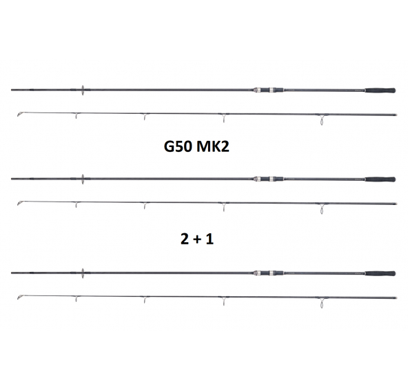 Verze vlajkové lodi kaprových prutů Mivardi. Po dvou letech náročného vývoje představujeme prut, který boří všechny hranice svojí třídy a svými vlastnostmi se řadí mezi absolutní špičku na trhu. Extrémně výkonný blank první generace je nyní lehčí, avšak nabízí ještě větší dynamiku a o 30% vyšší odolnost při šokovém zatížení. Všechny verze prutu prošly pečlivým laděním vlastností blanku, testovací křivky i vyvážení. Důraz je stále kladen na extrémní výkon při nahazování a zároveň příjemný pocit z práce při zdolávání, kdy je prut schopen velmi aktivně pracovat. Prut je osazen kvalitními očky SIC Ultralight Oversized s průměrem 16 mm na špičce a 50 mm u spodního očka. Blank je kompletně zpevněný jemnou punčochou z 1K cross woven carbonu. Laserem broušený povrch garantuje odolnost proti všem povětrnostním vlivům. Samozřejmostí je použití FUJI sedla navijáku a precizní zpracování s detailní výstupní kontrolou každého kusu. V nové sérii G50 MK2 jsou dostupné i verze s celokorkovou rukojetí. Ty jsou rovněž osazeny FUJI sedlem navijáku. Pro jejich výrobu se používá korek nejvyšší kvality (kategorie AAA). Akce je identická jako u modelů s dělenou rukojetí.
