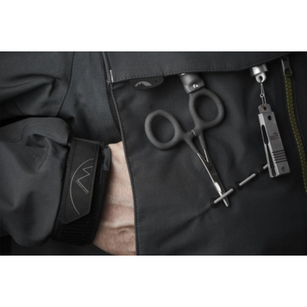 Magnety a nářadí: Naleznete zde mnoho různých možností jak uchytit rybářské nářadí. Bunda WS Pro disponuje dvěma magnetami o nosnosti 4kg (možnost rozšíření až na čtyři magnety). Magnety jsou umístěny vpředu s možností uchycení vašeho oblíbeného nářadí. Integrované elastické šňůrky a skryté magnety udržují nářadí během rybolovu poblíž bundy. Magnety můžete podle potřeby přesouvat z jednoho místa na druhé, aby byly vaše nástroje snadno dostupné. V levé náprsní kapse se nachází šňůrka na cívce, rybářské "jojo". Vysoko na zadní straně bundy naleznete D-kroužek pro zavěšení podběráku.