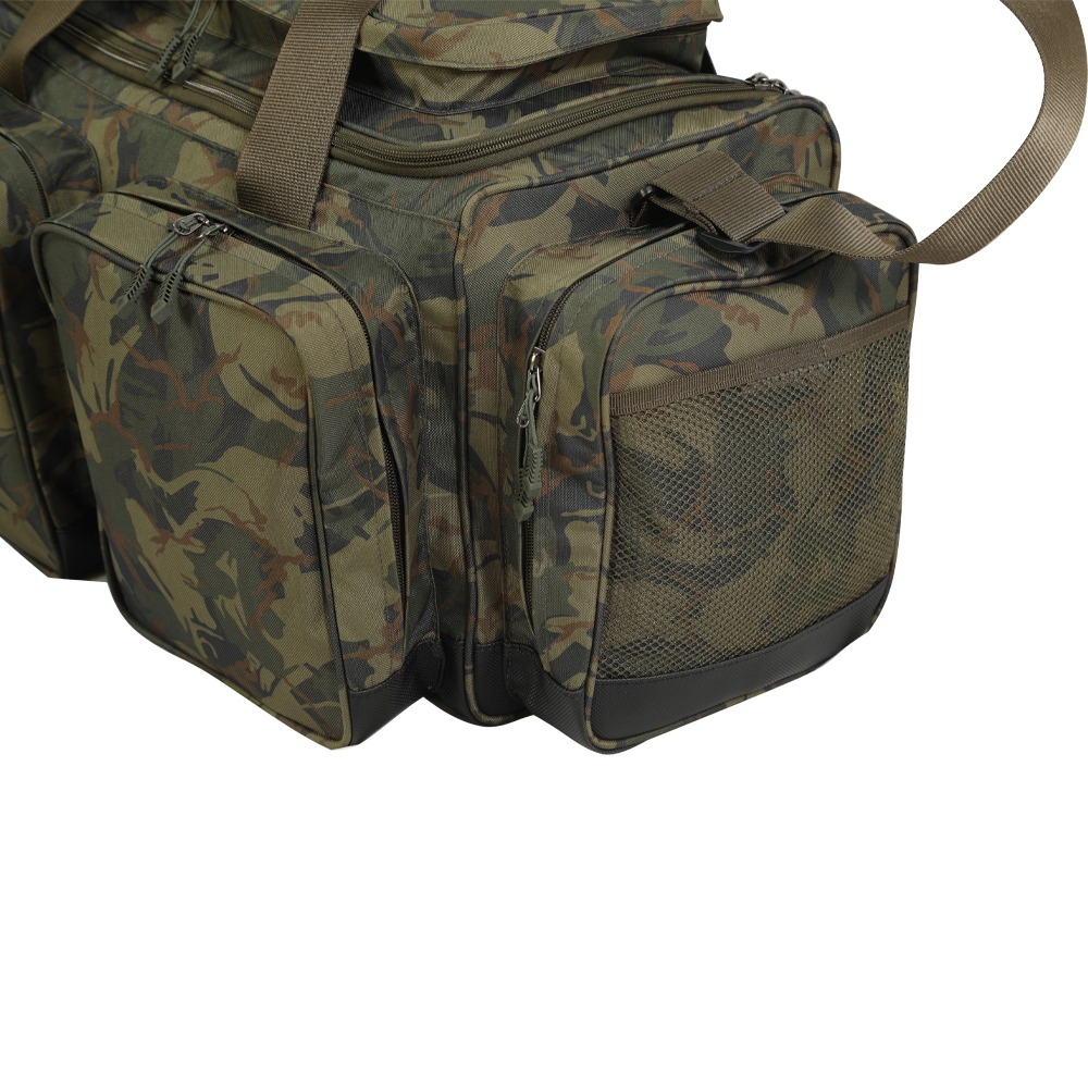 Vetší cestovní taška pro rybáře, která je osazena spoustou vnějších kapes, včetně praktické vrchní. Tato taška je vyrobena z atraktivního vode odolného nylonového materiálu s označením 210D v kamuflážovém designu. Součástí tašky je nastavitelným a odnímatelný polstrovaný ramenní popruh. - Velký hlavní úložný prostor - Pět vnějších kapes na zip pro uložení různých věcí - Vodě odolný nylonový materiál 210D - Rozměry: 50x28x30cm (bez vnějších kapes) - Hmotnost: 1,3kg