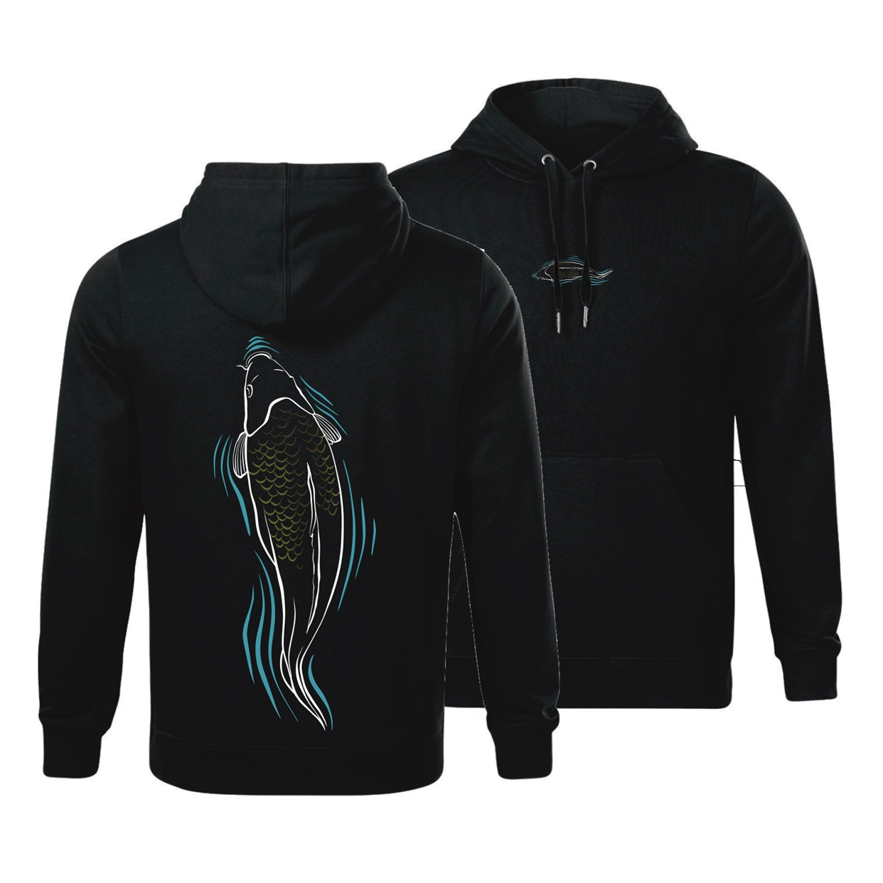 Mikina černé barvy s našim originálním návrhem plavajícího kapra u hladiny. Decentní návrh kapra na prsou a větší motiv na zádech....