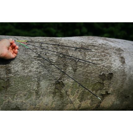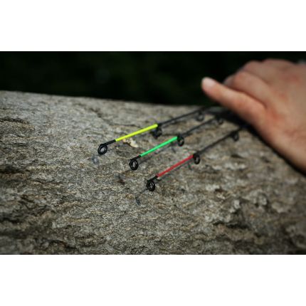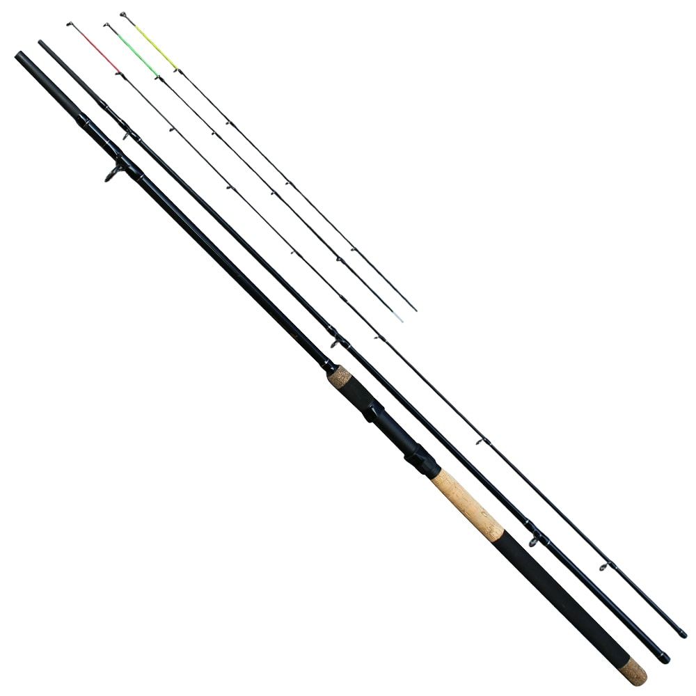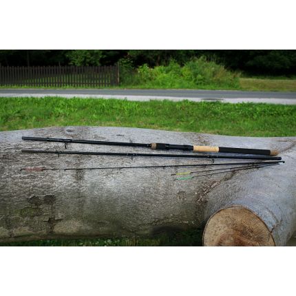 Luxusní řada feederových prutů, které jsou dodávány se třemi špičkami, za top cenu! Tyto feederové pruty jsou vyrobeny z kvalitního grafitu IM6 a mají středně rychlou akci. Jsou velmi univerzální, výkonné díky své parabolické akci. Díky rozsahu nabízených špiček, jste připraveni na jakou situaci a druh lovené ryby. Souhrn špiček dodávaných k prutu: žlutá – tužší (sklolaminátová), červená - střední tuhost (grafitová) a zelená – jemná (sklolaminátová). Prut je osazen kvalitními dvojitě vázanými SIC očky a má ergonomické DPS grafitové sedlo černé barvy. Rukojeť kombinuje přírodní korek s EVA pěnou a na koncích je drcený korek. Specifikace: Délka: 11 ft (3,3 m) Zátěž: 50-100 g Transportní délka: 115 cm Hmotnost: 244 g Počet dílů: 3+3