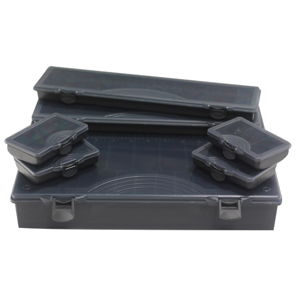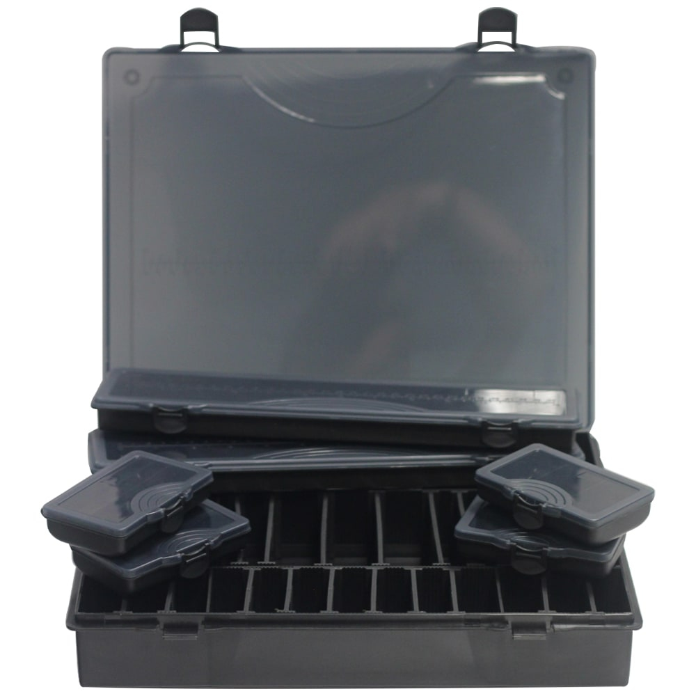 Kompletní kaprařský set krabiček, který je vyroben z extra tvrdého ABS plastu. Tento set obsahuje hlavní velkou krabičku, ve které jsou dvě podlouhlé krabičky na ukládání návazců a čtyři menší na uložení drobné rybářské bižutérie. - Kompletní plastová krabička pro organizované skladování - Obsahuje menší a střední krabičky na doplňky - Odnímatelné a nastavitelné přihrádky - Rozměry: 36x29x6cm - Hmotnost: 1,5kg