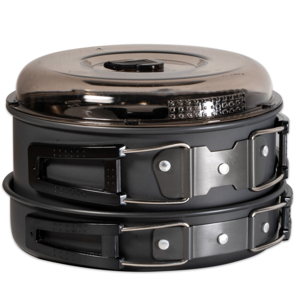 Campingová kuchyňská sada, která obsahuje konvičku, pánev a hrnec s pokličkou. Vše je vyrobeno z lehkého, eloxovaného hliníku a pro snadný transport vše pasuje do sebe....