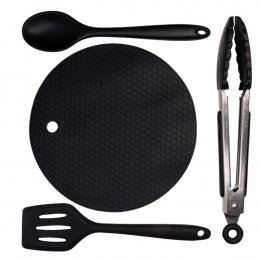Praktická sada nádobí pro snadnou přípravu jídla v přírodě. Silikonová sada, která má nepřilnavý povrch, který se snadno čistí. Součástí sady je odkládací podložka, grilovací kleště, obracečka a lžíce. Vyrobeno za 100% potravinářského silikonu, kterým zároveň chráníte své nádobí proti poškrábání. Specifikace: - délka kleště: 20 cm - délka obracečka: 21 cm - délka lžíce: 20 cm - průměr podložky: 18 cm - hmotnost celé sady: 168 g Odkaz na video: http://www.youtube.com/watch?v=xki0uIia86o