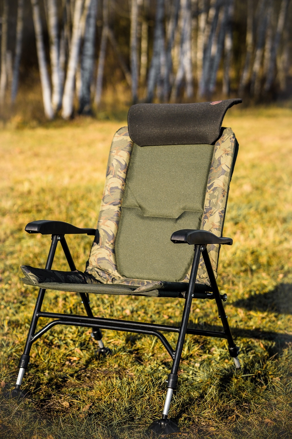 Zcela nová sedačka, která má inovativní výškově nastavitelnou opěrku hlavy a praktické polohování zádové opěrky pomocí područek. - Polstrování v kombinaci zelené a kamuflážové látky - Nastavitelná opěrka hlavy - Loketní podpěry s polohovatelným nastavením opěradla - Ocelová konstrukce o průměru 22 a 25 mm - Výškově nastavitelné nohy pomocí kvalitních zámků - Velké pacičky proti zaboření do bláta - Rozměry: 47 x 56 x 42/89 cm - Váha: 6,8 kg Odkaz na video: http://www.youtube.com/watch?v=2q3-aengk_A