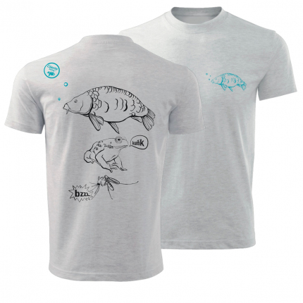 Kvalitní dětské tričko v šedé barvě s naším originálním designem kapříka, žabky a komára na zádech. Na hrudi je menší kapřík v tyrkysové barvě a decentní logo výrobce na zadní části ramene....