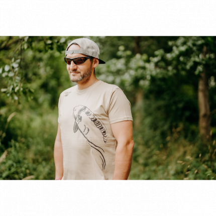 Kvalitní pánské tričko v béžové barvě s naším originálním designem vyplouvajícího kapra v přední části....