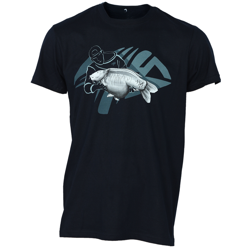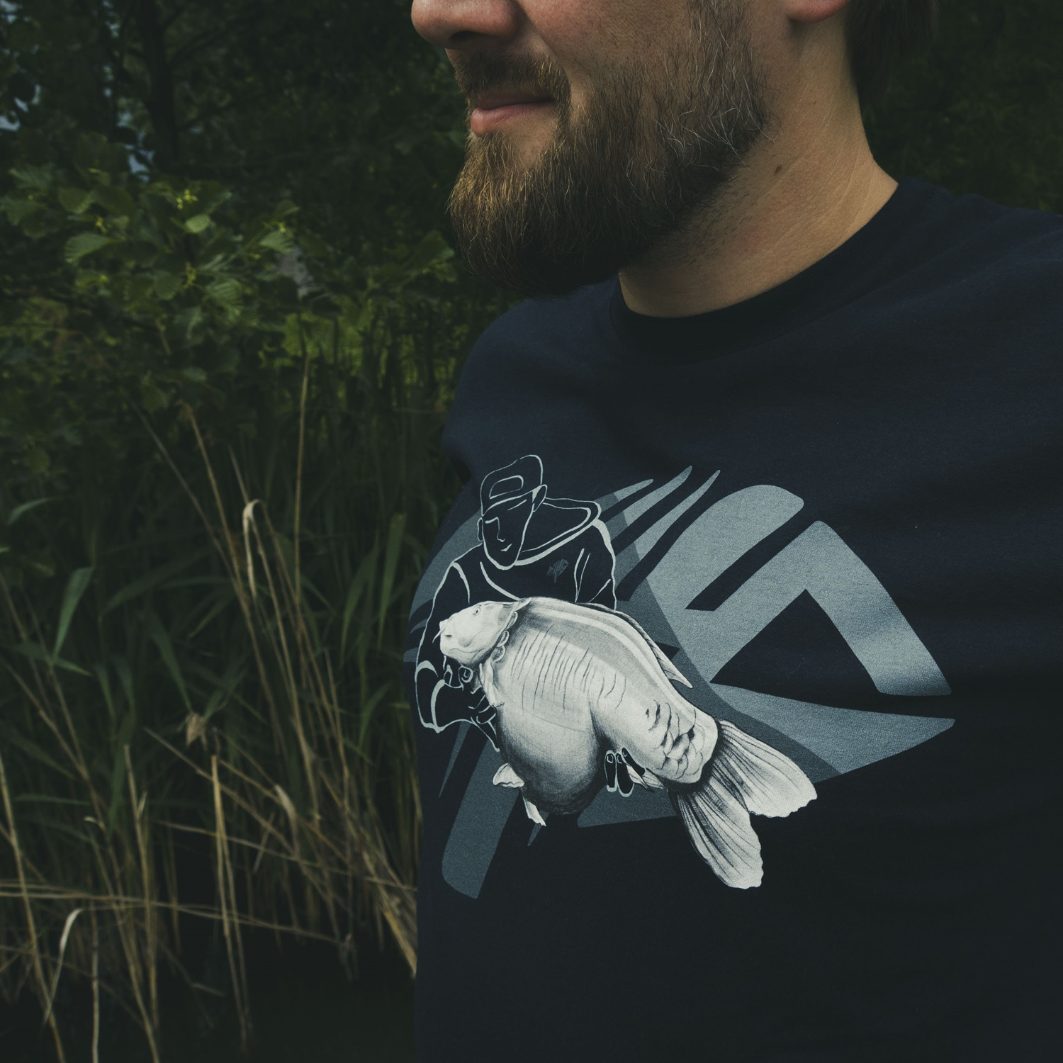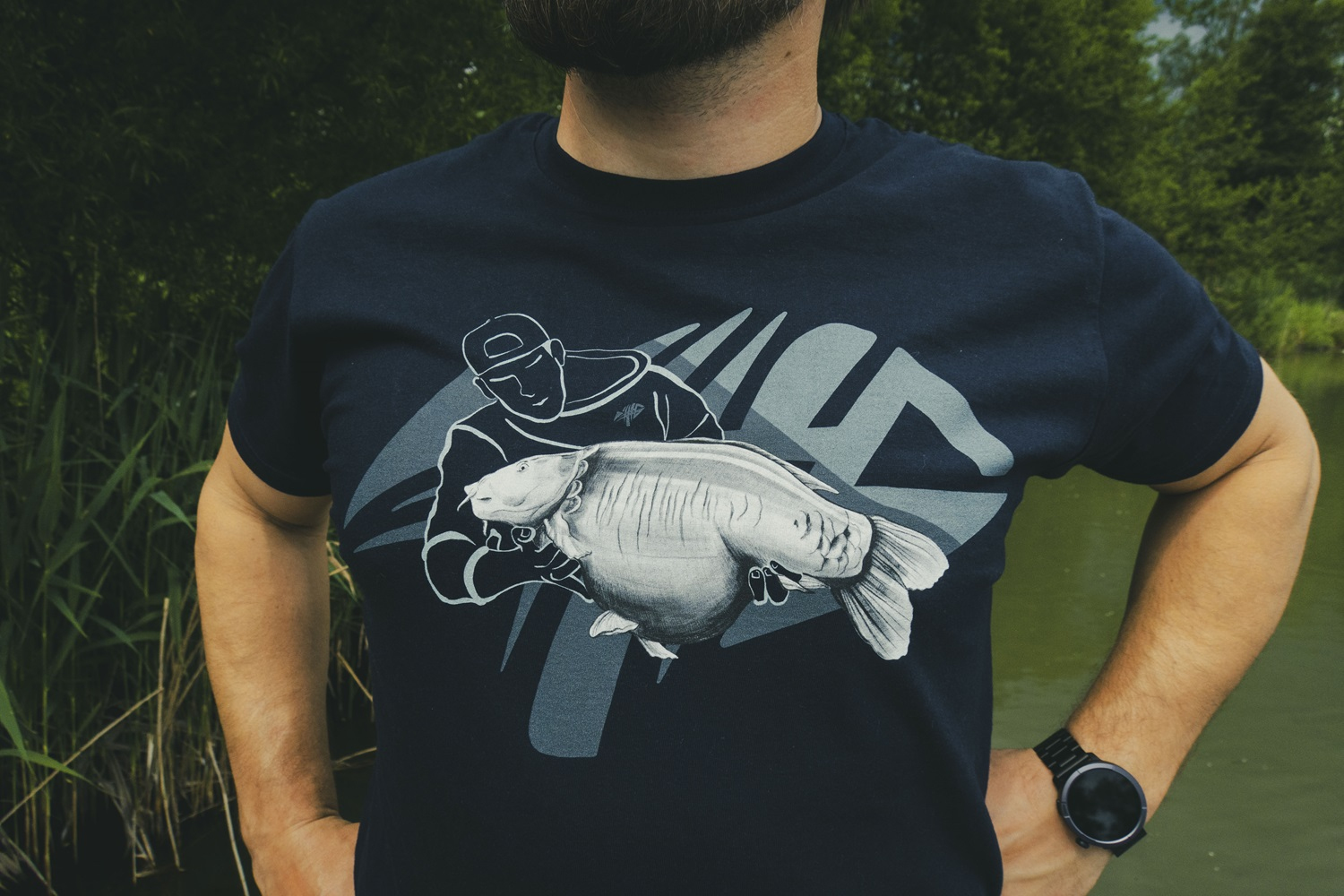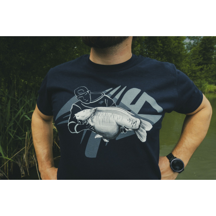 Kvalitní tričko v tmavě modré barvě s designem rybář s úlovkem kapra. - Moderní střih - Materiál: Bavlna 100% - Velikosti: S, M, L, XL, 2XL a 3XL