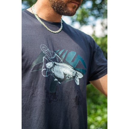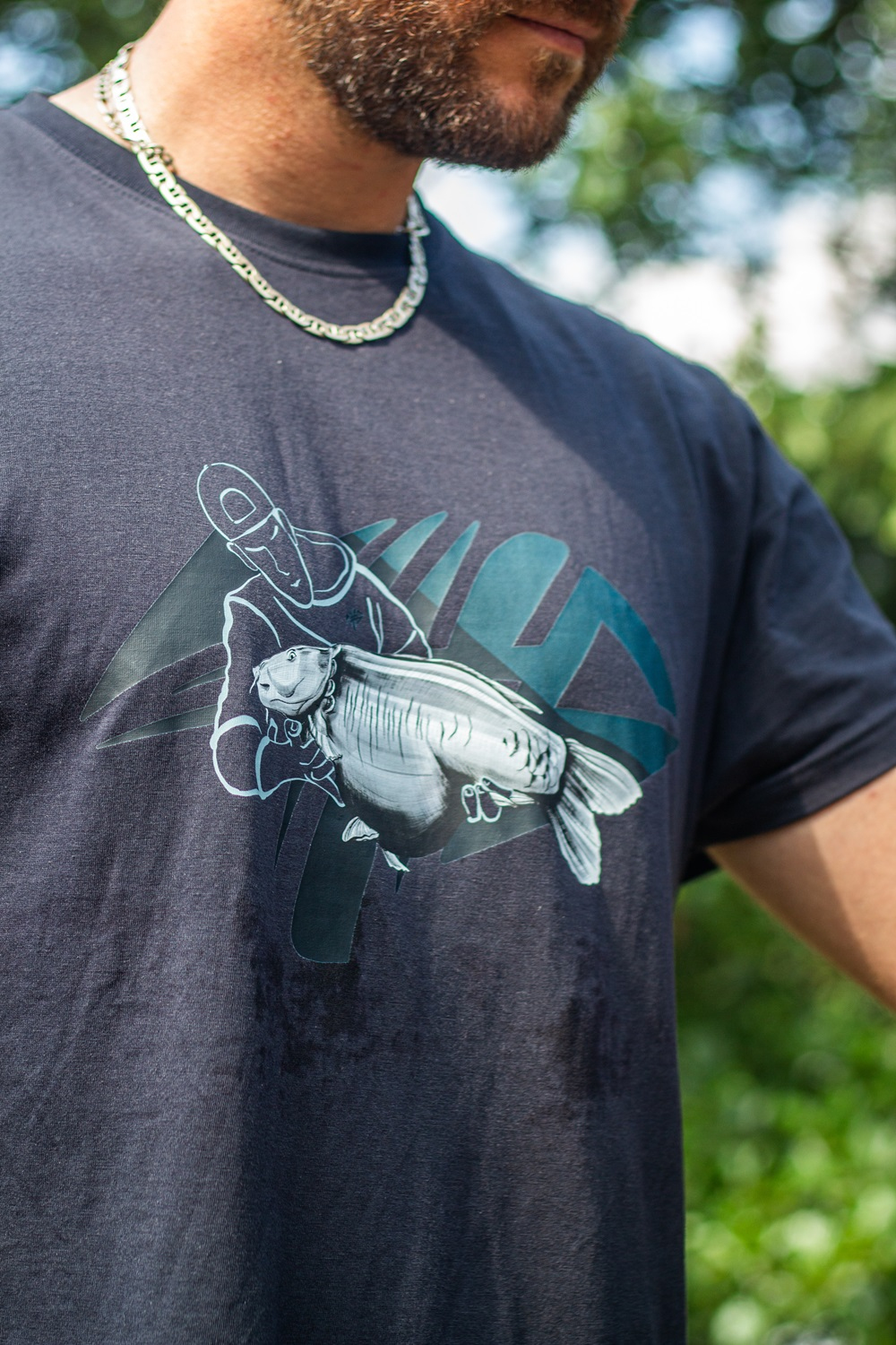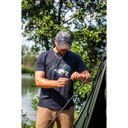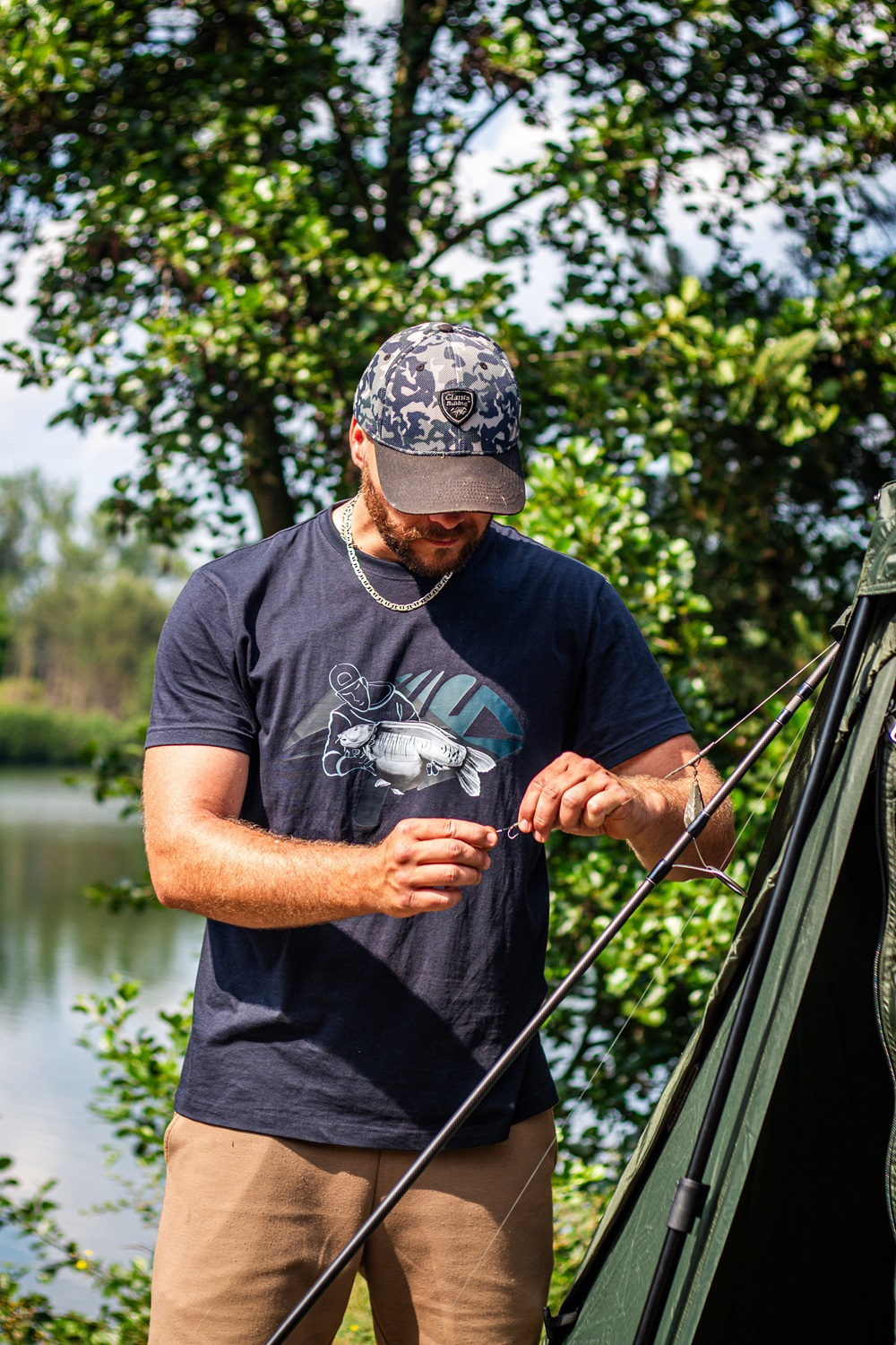 Kvalitní tričko v tmavě modré barvě s designem rybář s úlovkem kapra. - Moderní střih - Materiál: Bavlna 100% - Velikosti: S, M, L, XL, 2XL a 3XL