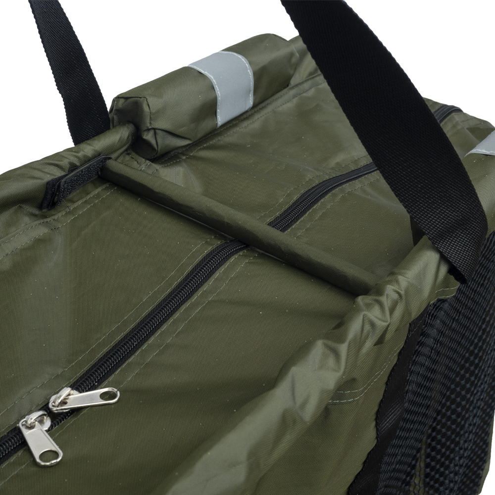 Velký a propracovaný vážící sak, ve kterém můžete bezpečně též přechovávat svůj úlovek. Vážící sak má čtyři plováky, které mají reflexní pásky pro snadnou viditelnost v noci. Ve vrchní centrální části je dvojitý popruh, který je zakončen ocelovými kroužky a je určen k připojení váhy. Dvojité zipy jsou po celé délce. Velký důraz, byl kladen na síťové otvory, aby k úlovku proudil dostatek prokysličené vody. Z obou boků saku jsou plastové „D“ kroužky, na které je možno připojit 3m lano, které je zakončeno plovákem s plastovým kolíkem, který je určen k zajištění saku u břehu. To vše je ukryto v kapsičce na suchý zip. Je dodáván včetně nepromokavého obalu, který je zevnitř pogumovaný, takže zabrání úniku vody a pachu ze saku. Rozměry: Délka: 120 cm Šířka: 29 cm Výška 65 cm Hmotnost: 1,1 kg Barva: zelená