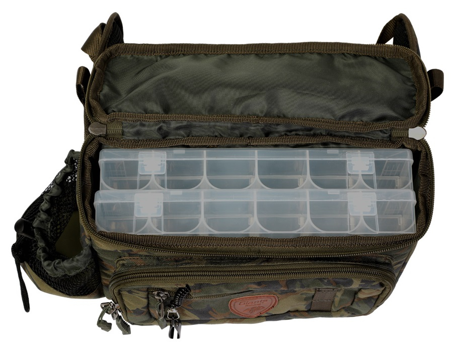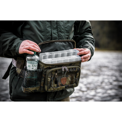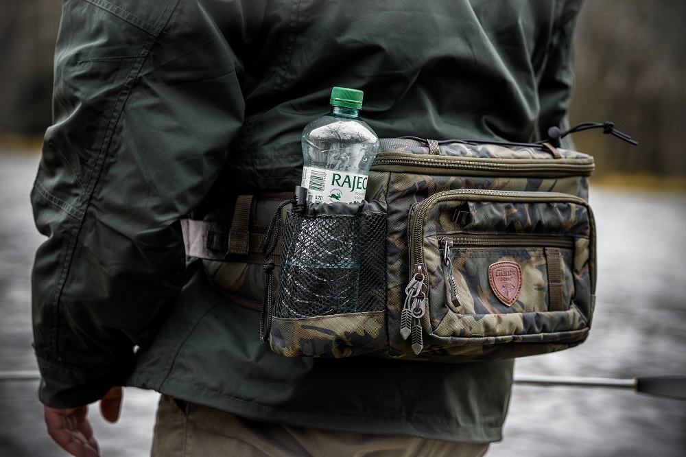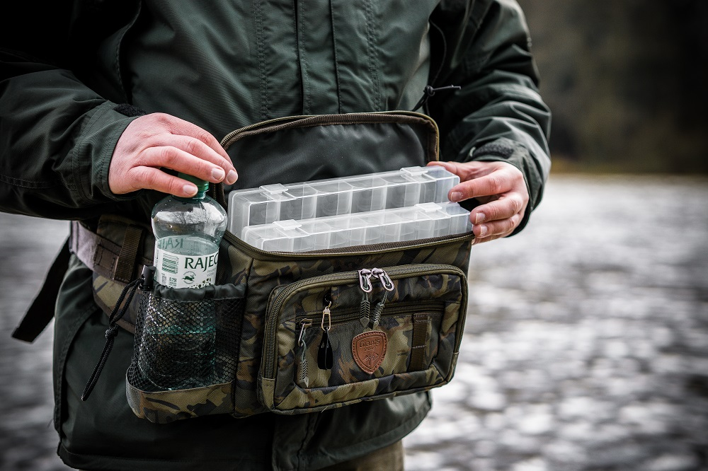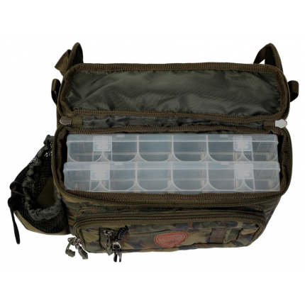 Vláčecí ledvinka s integrovaným cvakátkem na vlasec, která obsahuje dvě plastové krabičky na nástrahy. - Pření kapsa s integrovaným cvakátkem vlasce - Dvě větší krabičky ( 27 x 18 cm ) v hlavní části tašky - Boční síťová kapsa na láhev s vodou - Vodu odpudivá látka v kamuflážovém vzoru - Rozměry: 28x12x20cm - Hmotnost: 0,9g