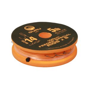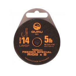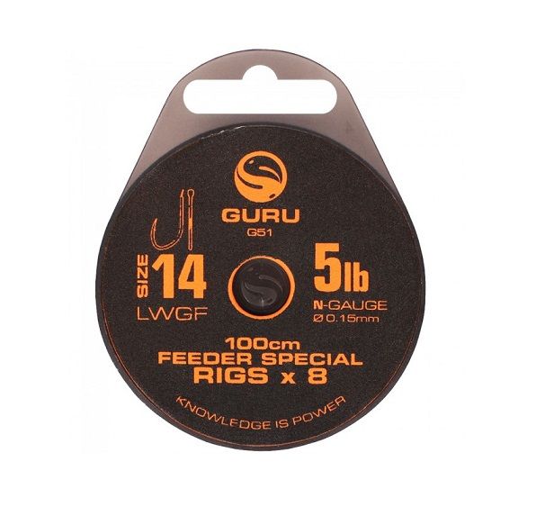 Hotové návazce 1m s různými velikostmi LWGF háčků od značky Guru Tackle. Guru LWGF speciální feeder háčky s micro protihrotem. Vázány na N Gauge. Cívky EVA kompatibilní do Guru Rig Box.