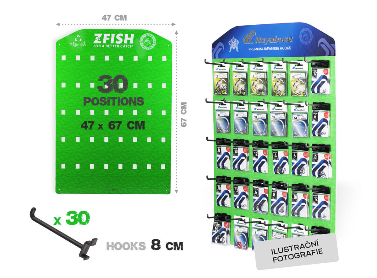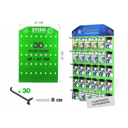 Ideálním pomocník pro dokonalou prezentaci kompletního sortimentu prémiových japonských háčků. Kvalita materiálu a zpracování těchto plat spolu s elegantním designem zajistí, že se na Vaší prodejně rozhodně neztratí a jsme si jistí, že neunikne pozornosti žádného zákazníka. Plato disponuje velkou plochou k zavěšení produktů na prodejní háčky. Součástí balení těchto plat jsou samozřejmě i samotné závěsné háčky a to v počtu 30 ks