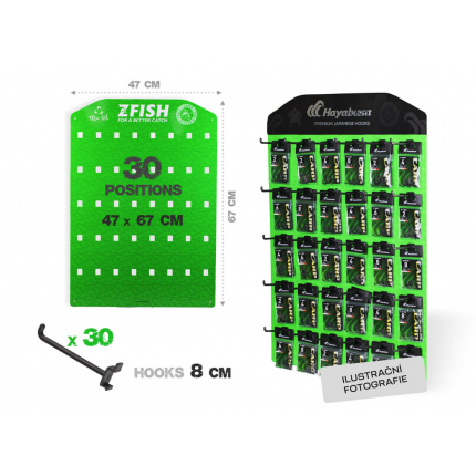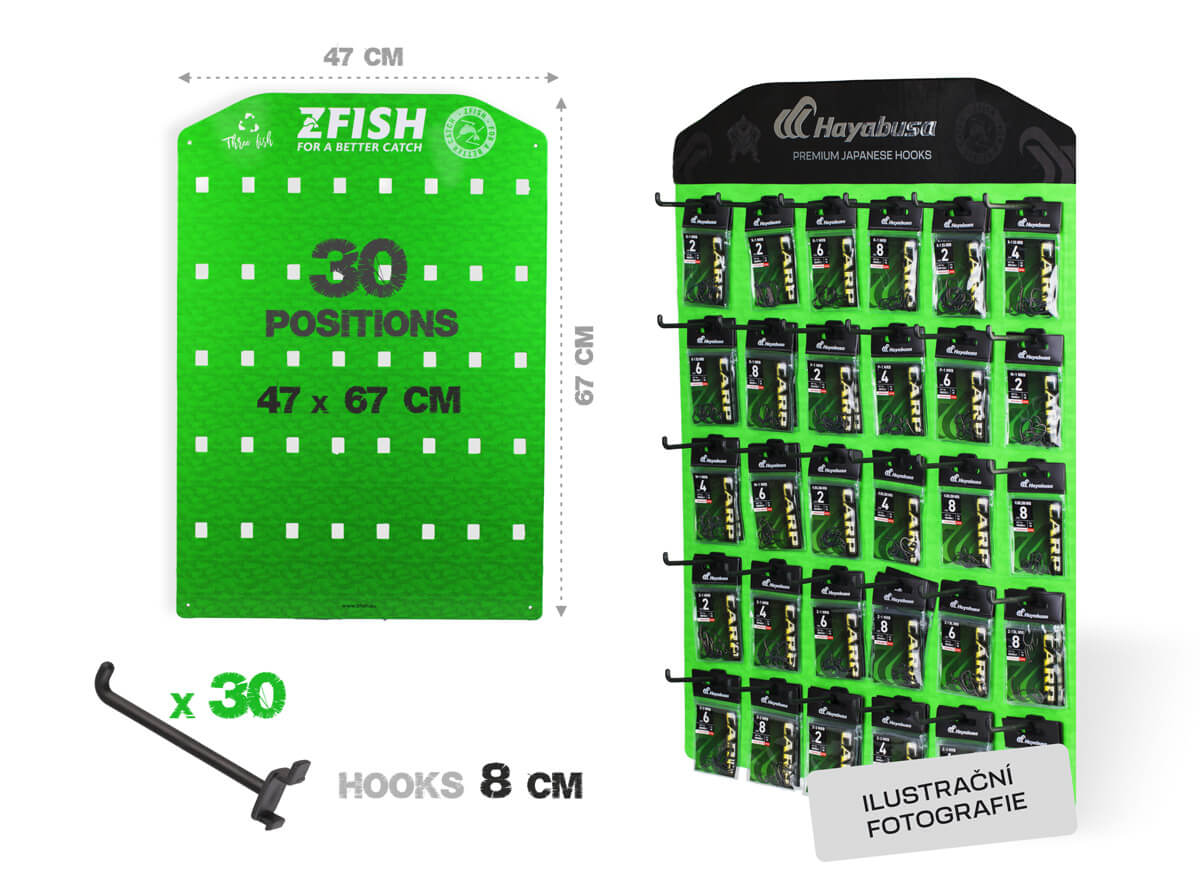 Ideálním pomocník pro dokonalou prezentaci kompletního sortimentu prémiových teflonových kaprových háčků japonské výroby. Kvalita materiálu a zpracování těchto plat spolu s elegantním designem zajistí, že se na Vaší prodejně rozhodně neztratí a jsme si jistí, že neunikne pozornosti žádného zákazníka. Plato disponuje velkou plochou k zavěšení produktů na prodejní háčky. Součástí balení těchto plat jsou samozřejmě i samotné závěsné háčky a to v počtu 30 ks