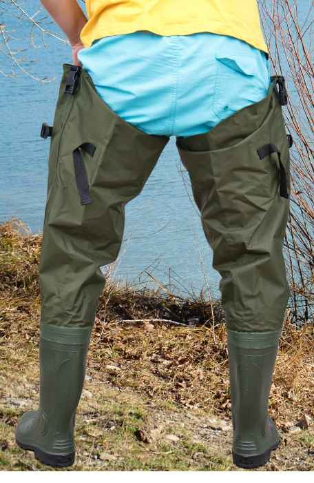Holínky do rozkroku na brodění mají tlustou podrážku a pevnou gumovou botu která zabezpečuje dokonalou stabilitu i na kluzkém terénu.