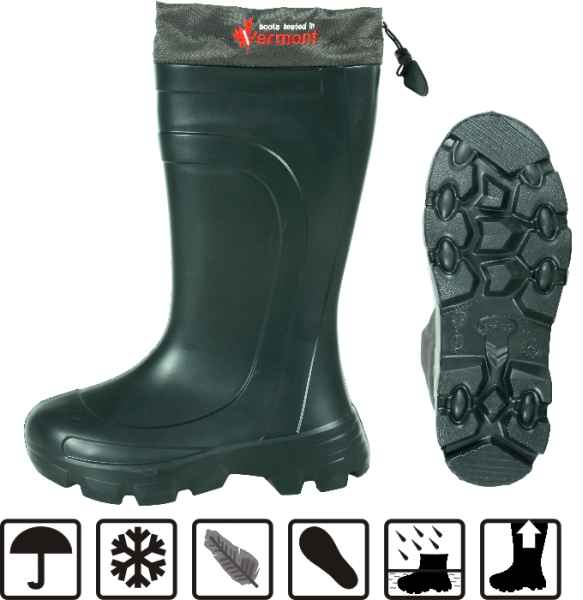 Holínky Vermont 877 do - 70 ° C Velmi lehké EVA holínky které váží jen 1000g, nesrovnatelně lehčí než holínky vyrobené z PVC nebo gumy. Vysoká izolace je zajištěna díky vysoce kvalitnímu PVA materiálu ve kterém se nacházejí vzduchové bubliny. Vaši nohu udrží v teple a suchu až do -70 ° C. Vyjímatelná vložka je vyrobena z třívrstvého materiálu (...