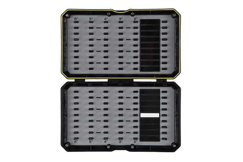 Krátké pouzdro na návazce ideální pro návazce v délce 5 a 15 cm 18 kolíčků na háčky každý až pro 10 háčků (180 háčků celkem). Vnitřní měřící kolíčky pro přesné určení potřebné délky návazce. Gumový povlak neklouže na površích. Nalisované gumové těsnění braní vnikání vody Bezpečné magnetické zavírání. Součástí vnější i vnitřní štítky Rozmě...
