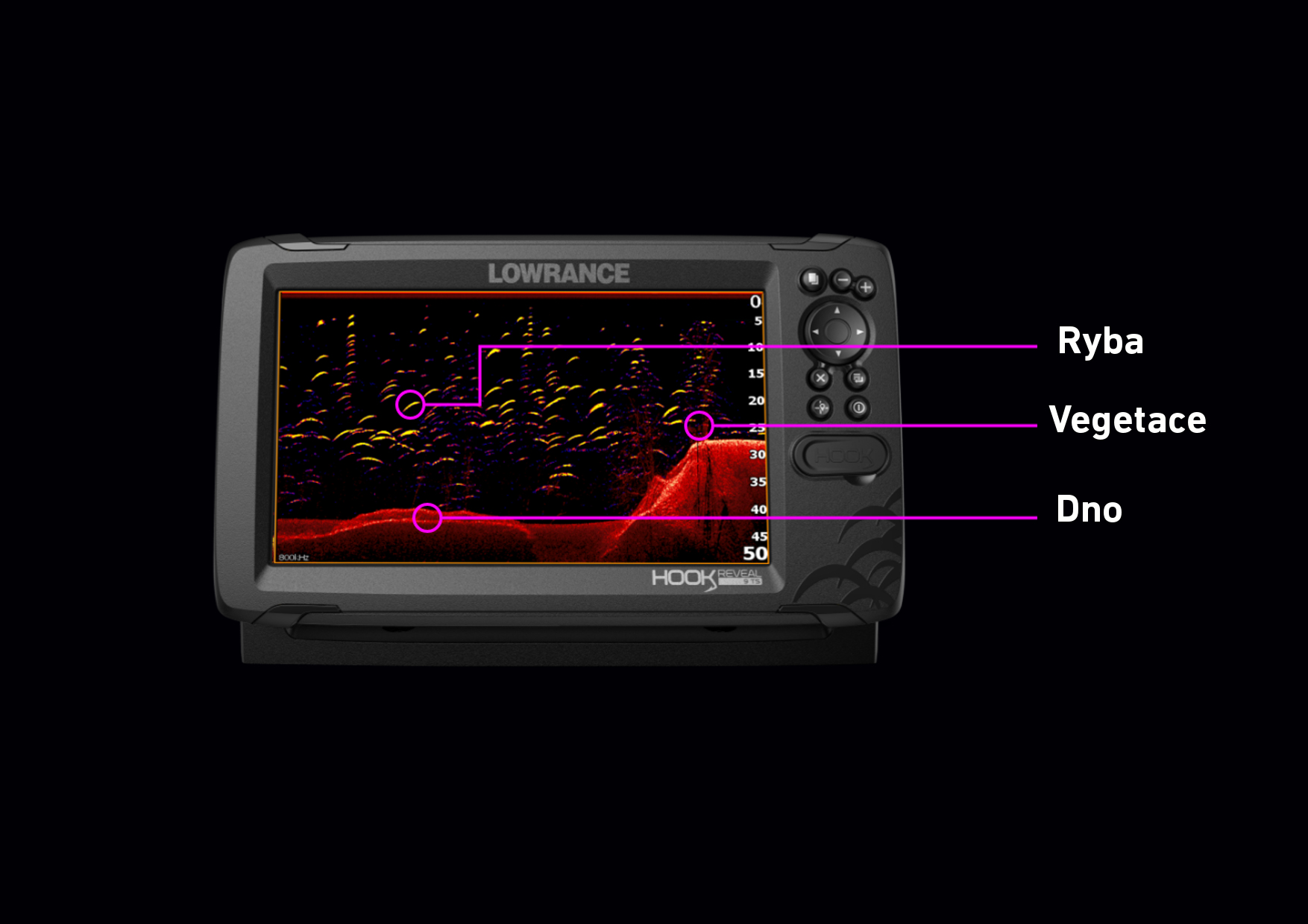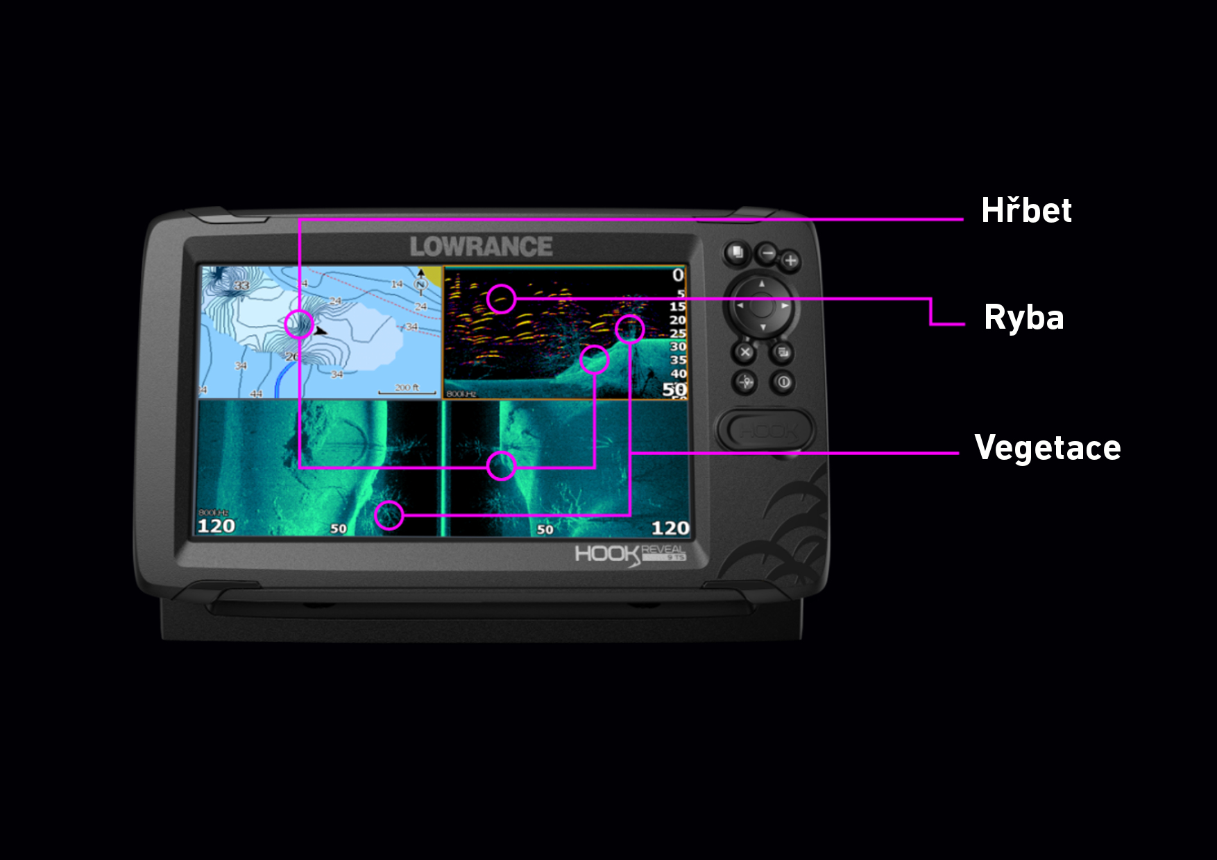 Zcela nový HOOK Reveal poskytuje silný výkon s osvědčenými nástroji pro vyhledávání ryb, včetně automatického ladění sonaru, SideScan * a DownScan Imaging ™ a nyní nově i FishReveal ™, který usnadňuje orientaci v zobrazení ryb kombinací výhod sonaru Lowrance CHIRP a DownScan Imaging ™ na jedné obrazovce.