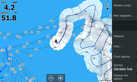 Ať už lovíte na svém oblíbeném místě či prozkoumáváte neznámou vodu, snadno naleznete ty nejlepší oblasti, které můžete díky funkci Genesis Live okamžitě zmapovat.
