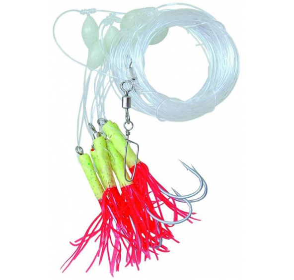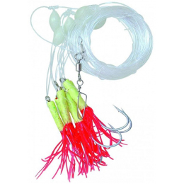 Návazec obsahuje velké fosforeskující korále, pevné obratlíky a karabinu k rychlé výměně spodního závaží.