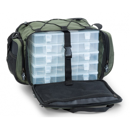 Velmi příjemná přívlačová taška, která je určena na delší vycházky. Je v ní dostatek místa na mnoho věcí a součástí tašky je také 5 plastových krabic na nástrahy. I přes to se taška nosí velmi pohodlně. Velmi praktické jsou také vnější kapsy, do kterých si můžete uložit věci, které často používáte.