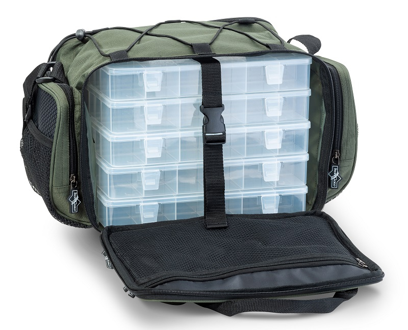 Velmi příjemná přívlačová taška, která je určena na delší vycházky. Je v ní dostatek místa na mnoho věcí a součástí tašky je také 5 plastových krabic na nástrahy. I přes to se taška nosí velmi pohodlně. Velmi praktické jsou také vnější kapsy, do kterých si můžete uložit věci, které často používáte.