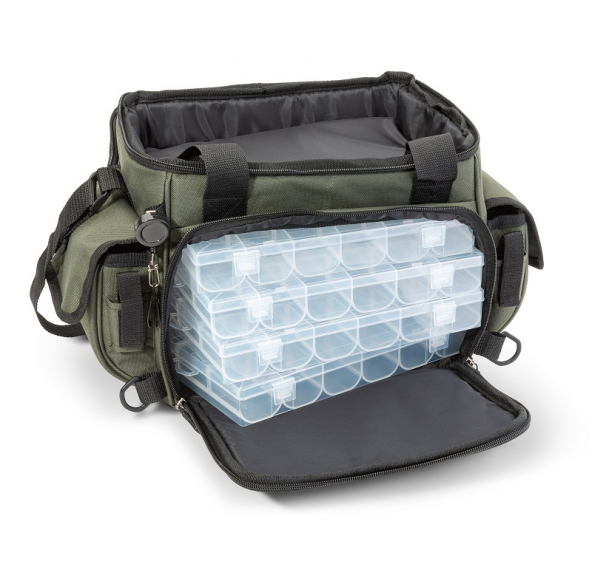 Přívlačová taška na nástrahy s mnoha vnějšími kapsami, do kterých můžete dát krabičky, peán, metr, povolenku a mnoho dalšího. V ceně jsou i čtyři plastové boxy na nástrahy, které jsou vyrobeny tak, aby přesně zapadly do hlavní kapsy.
