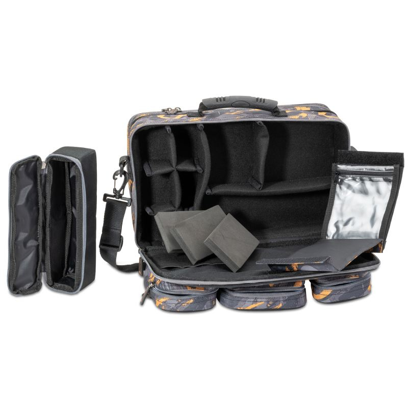 Tato taška není určena jen pro pstruhaře, polstrované pododdíly poskytují dostatek prostoru pro veškeré příslušenství všem rybářům specializujícím se na lov dravých ryb. Uvnitř brašny je prostor rozdělen na 6 malých přihrádek (odnímatelné) pro bezpečnou přepravu nástrah, 3 desky z tvrdé pěny a menší taška na uložení splávků nebo sbirolin. Odnímatelná náprsní peněženka se čtyřmi kapsami na zip a třemi elastickými gumičkami pro vložení sbirolin nebo jiného příslušenství. Na zadní straně je cca 35 x 22 x 5 cm box pro uložení příslušenství. Na přední straně jsou další 3 kapsy pro snazší roztřídění věcí. Ergonomicky tvarovaná rukojeť a polstrovaný ramenní popruh zajišťují pohodlnou přepravu. ergonomicky tvarovaná rukojeť protiskluzový ramenní popruh 35 x 22 x 5 cm Vario Box odnímatelné polstrované přepážky 3 vnější kapsy malé odnímatelné pouzdro 3 desky z tvrdé pěny na návazce peněženka se 4 průhlednými přihrádkami 3 elastické gumičky pro připevnění sbirolin nebo příslušenství rozměry: cca 38 x 22 x 25 cm materiál: 300x300D ripstop ...