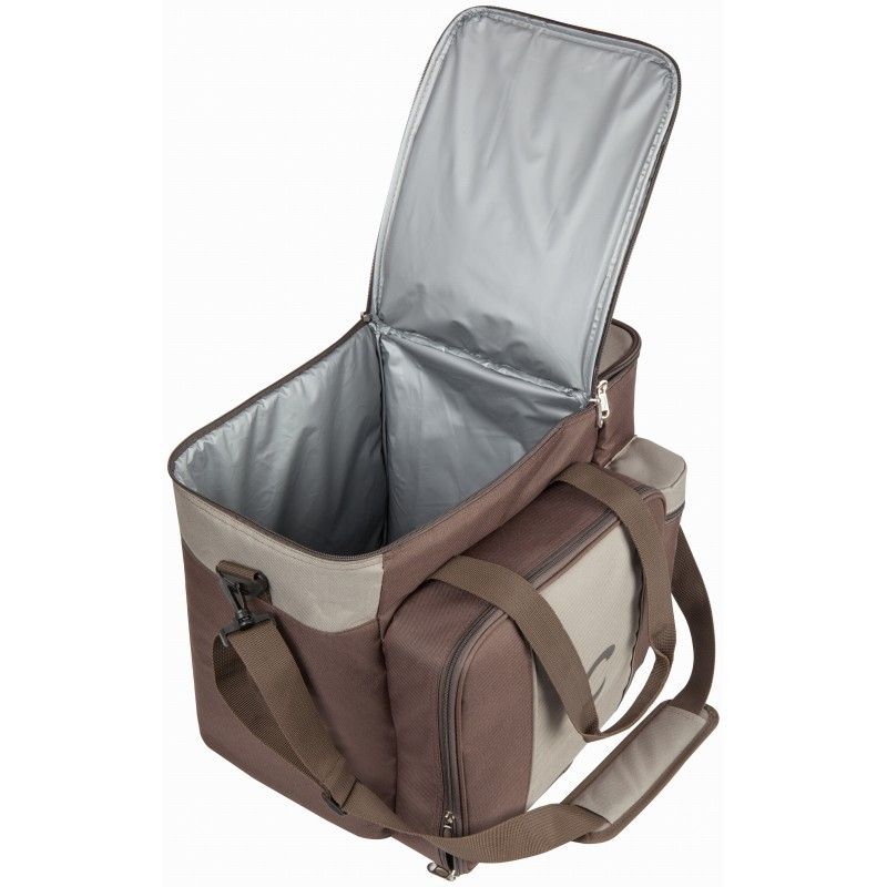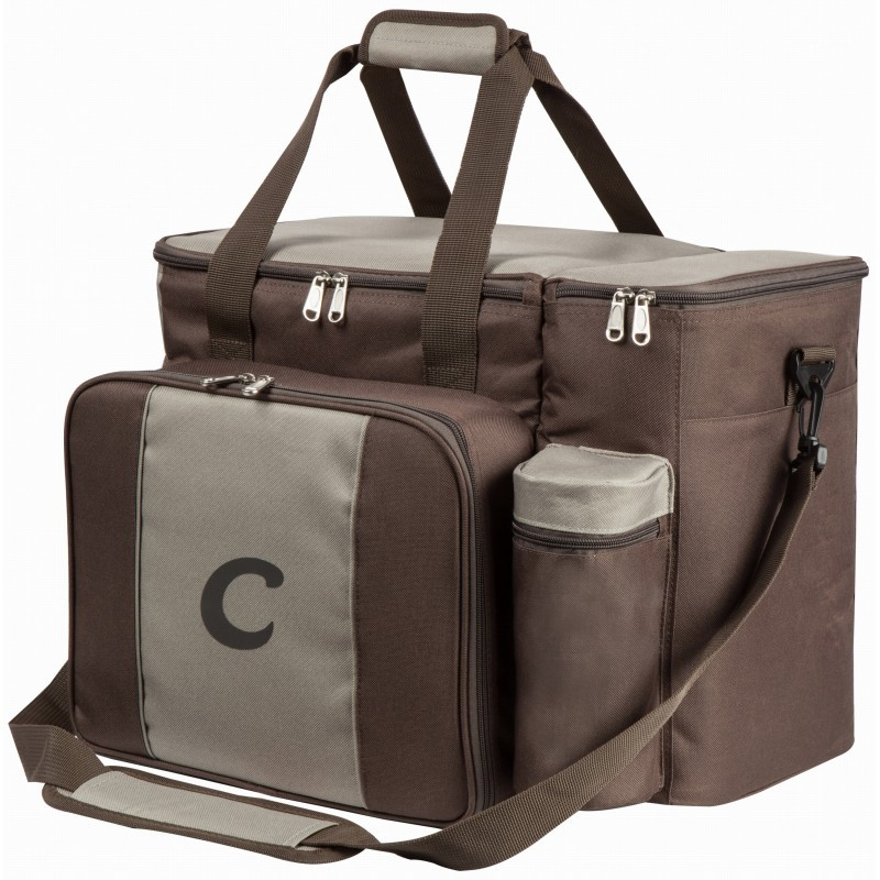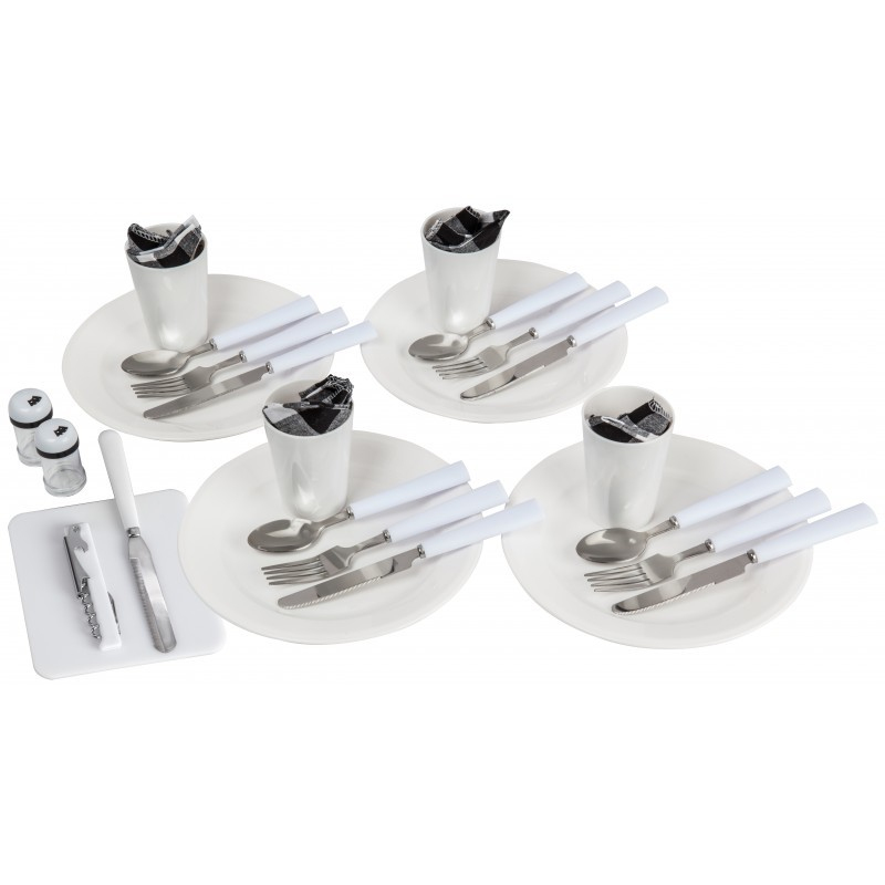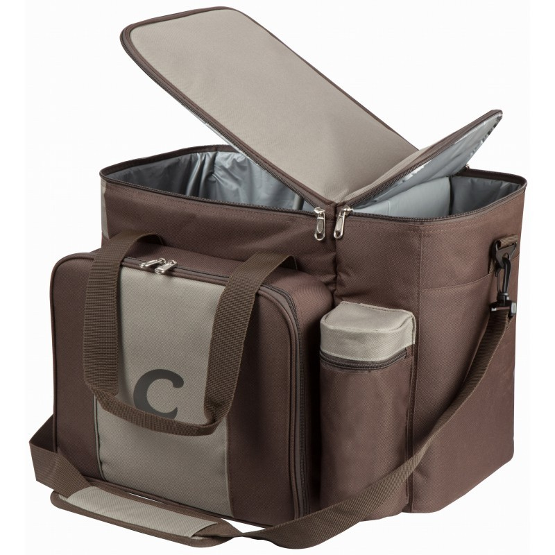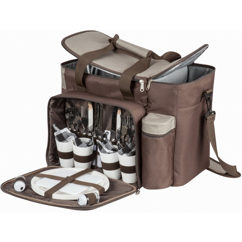 Jídelní souprava včetně polstrované termo tašky. Hlavní část tašky slouží jako termobox, který zachová jídlo či pití v chladu. Taška má po bocích dvě vnější kapsy. • Jídelní set určený pro 4 osoby • Materiál Oxford nylon • Objem 33 l • 2 vnitřní thermo kapsy • 1 vnější kapsa na láhev • Udržuje jídlo a pití chladné Celkové rozměry 43 x 33 x 33 cm Obsahuje: 4x šálek na kávu a čaj 4x lžička z nerez oceli 4x vidlička z nerez oceli 4x nůž z nerez oceli 4x ubrousek 1x slánka 1x pepřenka 1x zubatý nůž 1x nůž s vývrtkou a otvírákem lahví 4x plastový talíř 1x plastové prkénko