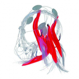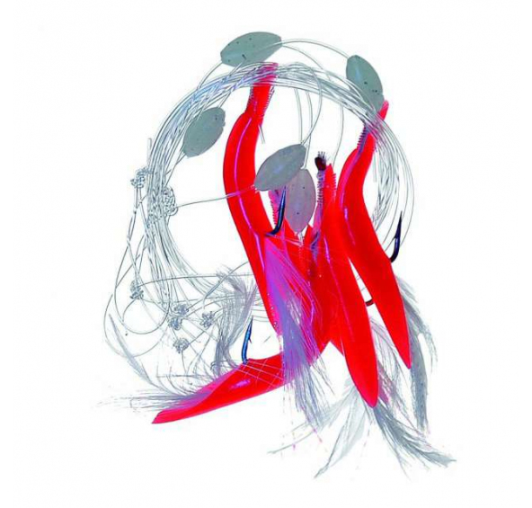 Návazec na moře. Červené flitrované trubičky s bílým ocáskem. Velice oblíbená nástraha do Norska na fjordy.