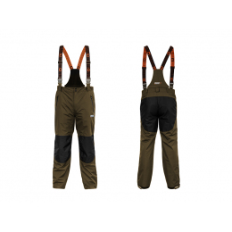 Jednou z hlavních výhod kalhot je vyvýšený pas v oblasti křížů, čímž bude spodní část vašich zad dokonale chráněna. V oblasti hýždí a kolen se nachází zesílená černá látka, jejímž úkolem je ochrana před znehodnocením, těchto používáním nejvíce náchylných částí kalhot. Zároveň efektně přispívá k celkovému designu, který dotváří i stylové kšandy s logy značky Delphin.