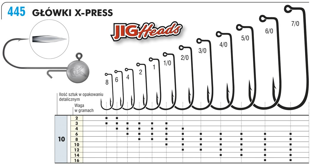 Jigové hlavy X-Press jsou vyrobeny na nejkvalitnějších, vybraných háČcích Kamatsu. Speciální, dvojitý proces kování čepele snadno zachytí jakoukoli rybu. Nástraha drží na svém místě na profilovaném drátu a lze ji také použít k navázání úzkou, štíhlou nástrahou bez obav z roztržení přední části. Tyto jigové hlavy vynikají kvalitou a ostrostí bez kompromisů, se kterými se nebudete chtít rozloučit při prvním rybaření. Baleno po 3 ks v sáčku