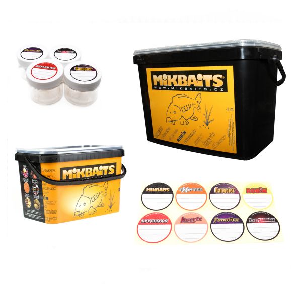 Set 15l + 5l kbelíku Mikbaits + 4 kelímky s těsnícím víčkem + samolepky Mikbaits. Ideální set pro skladování i většího množství návnad a nástrah.
