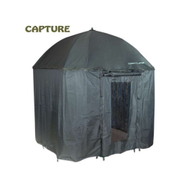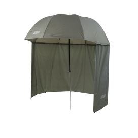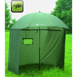 - Rybářský deštník s bočnicemi – Podstatou správné funkce tohoto deštníku je dobré ukotvení bočnic kovovými kolíky. Jste tedy chráněni nejen ze zhora, ale i z boku. Bočnice je upevněna zipem zhruba na 80% obvodu deštníku.